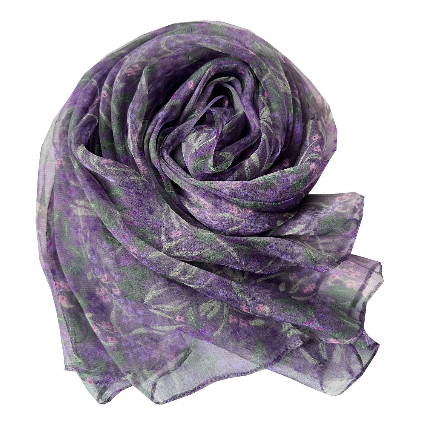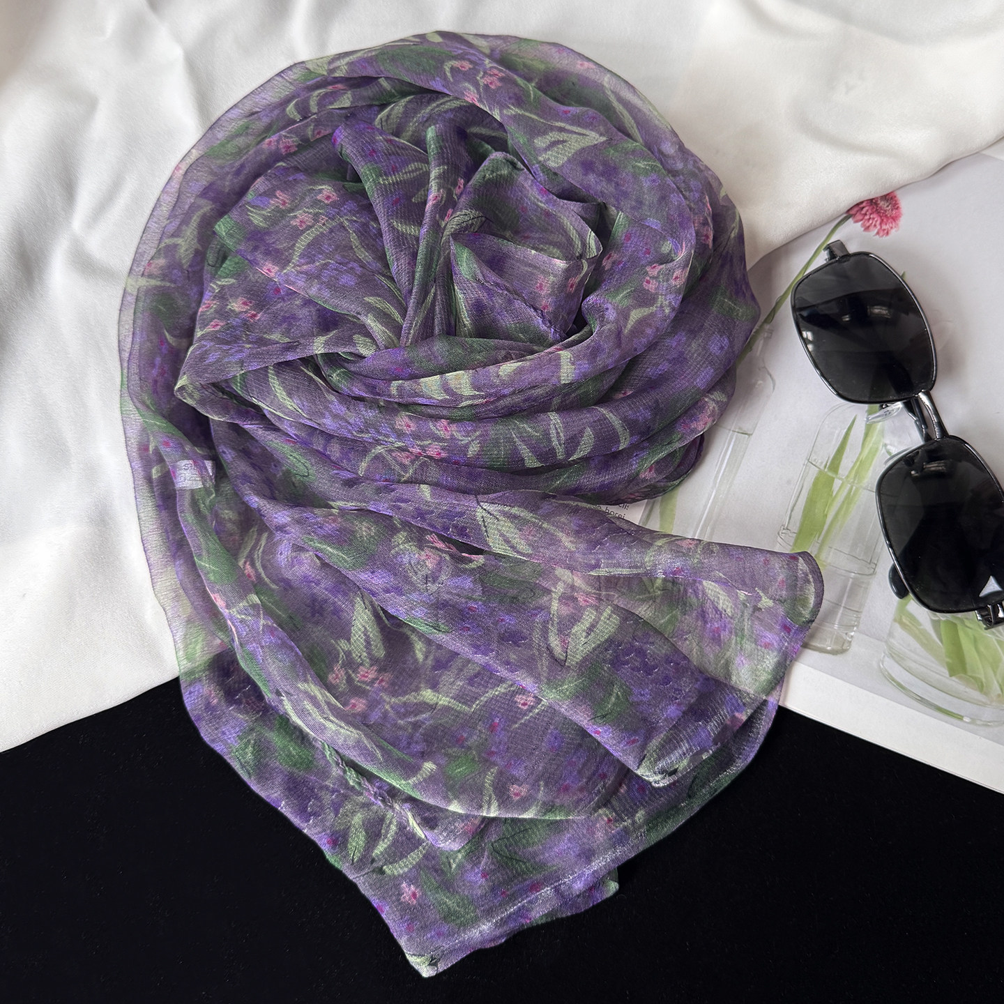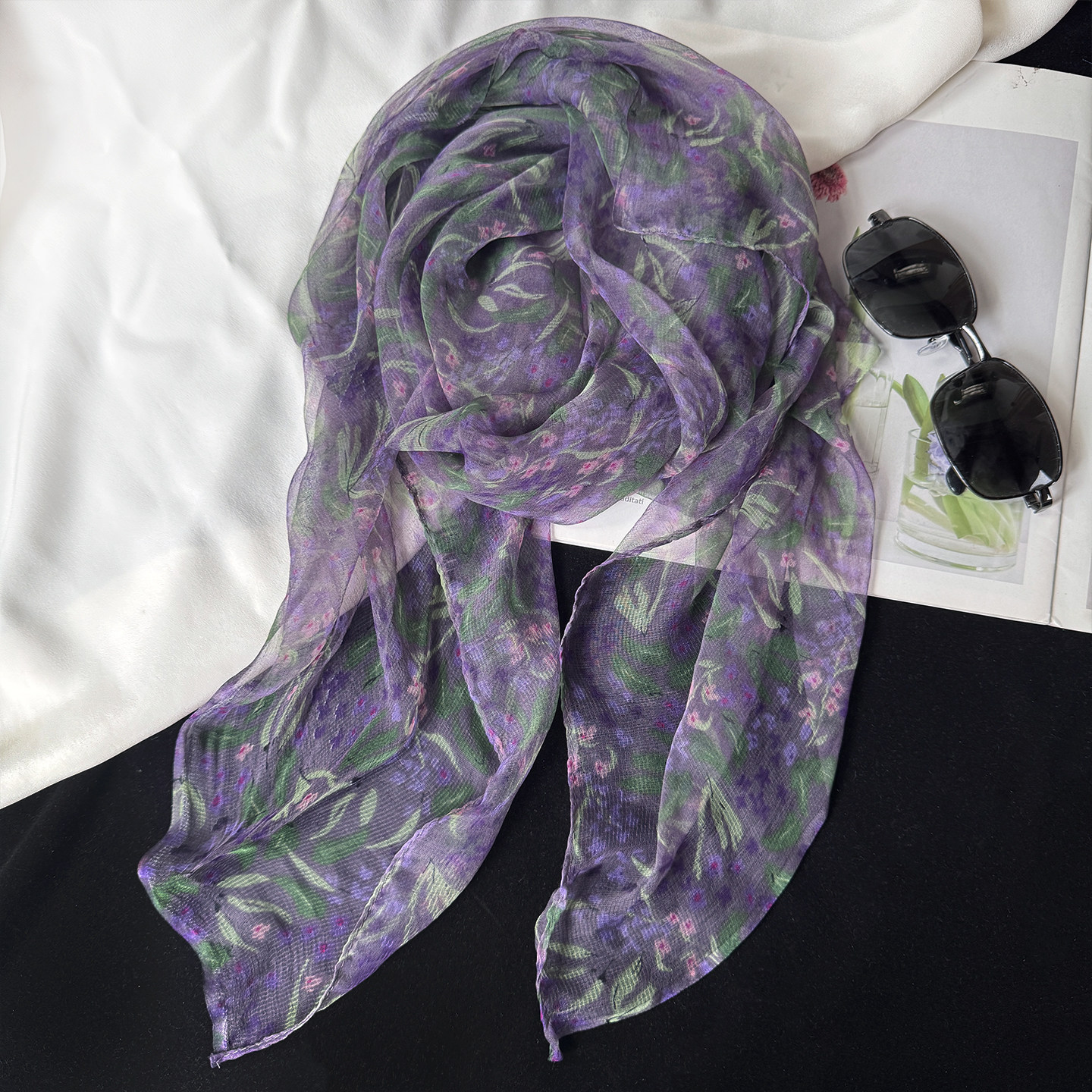 紫色花真丝桑蚕丝护颈薄款丝巾围巾妈妈春秋季长款东风纱百搭纱巾