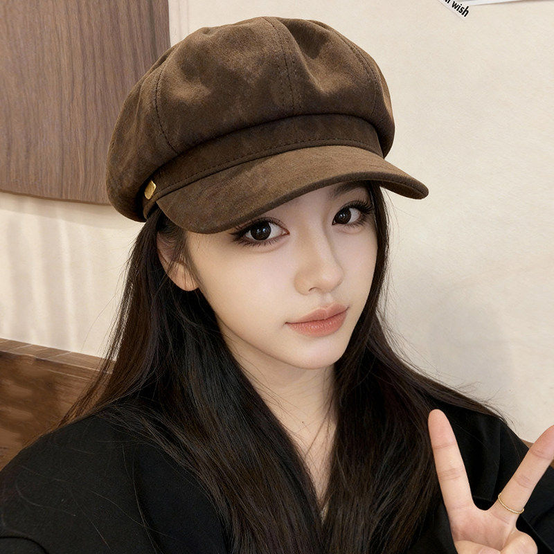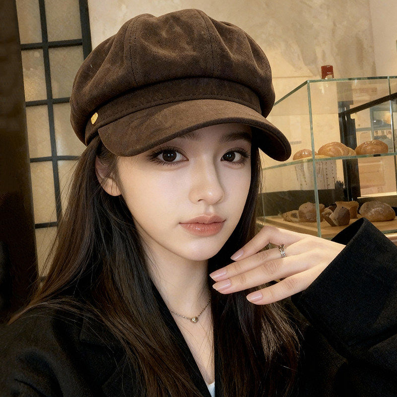麂皮绒棕色贝雷帽子女2025新款冬大头围八角帽显脸小画家报童帽
