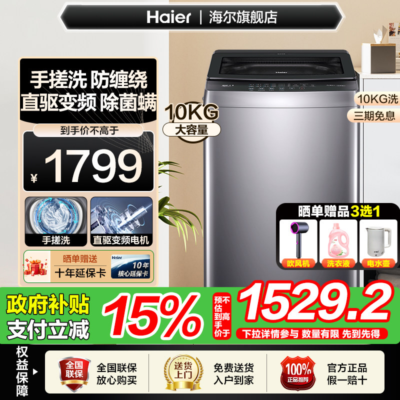 海尔10公斤手搓式直驱变频一级能效防缠绕全自动家用波轮洗衣机