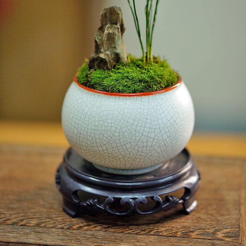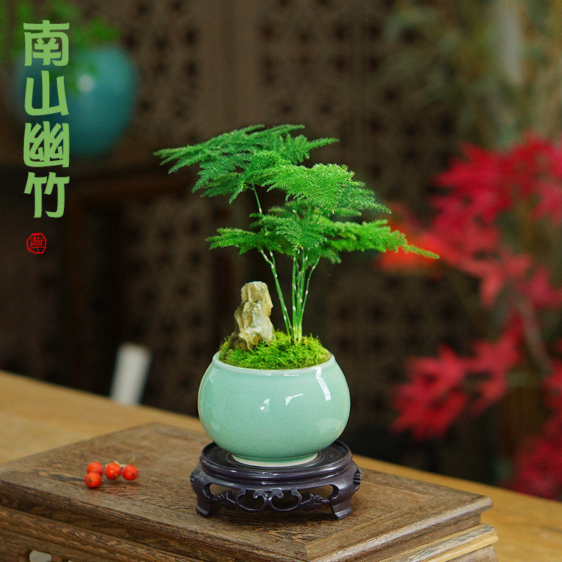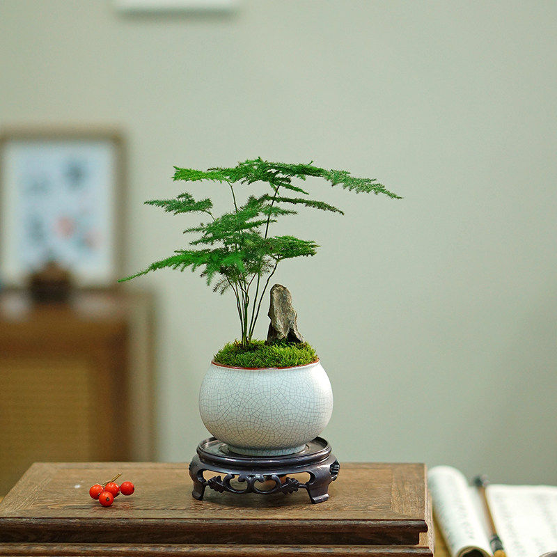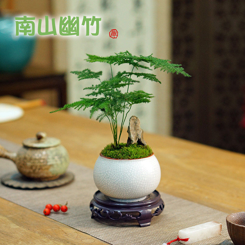 矮生文竹盆栽假山盆景中式创意植物办公室书房茶桌面耐阴好养绿植