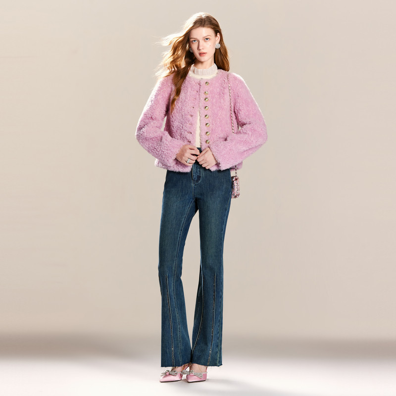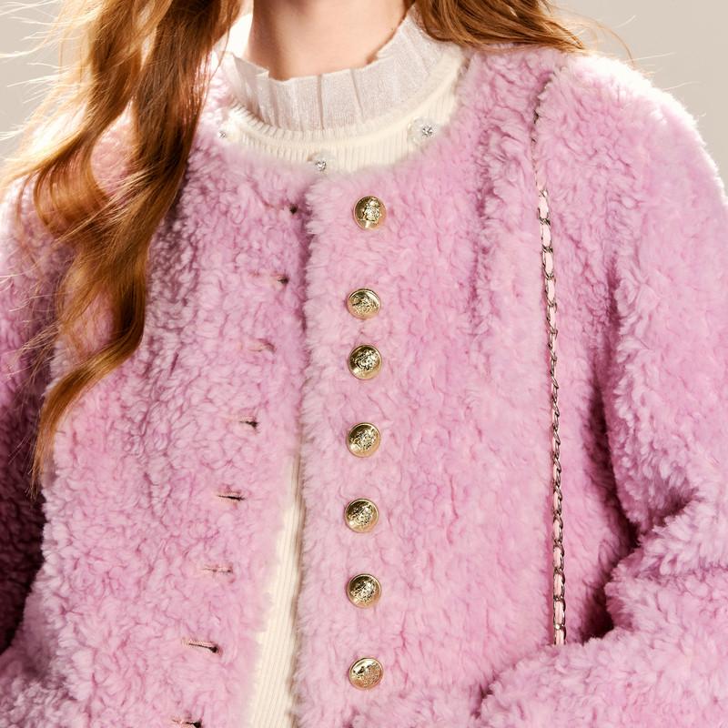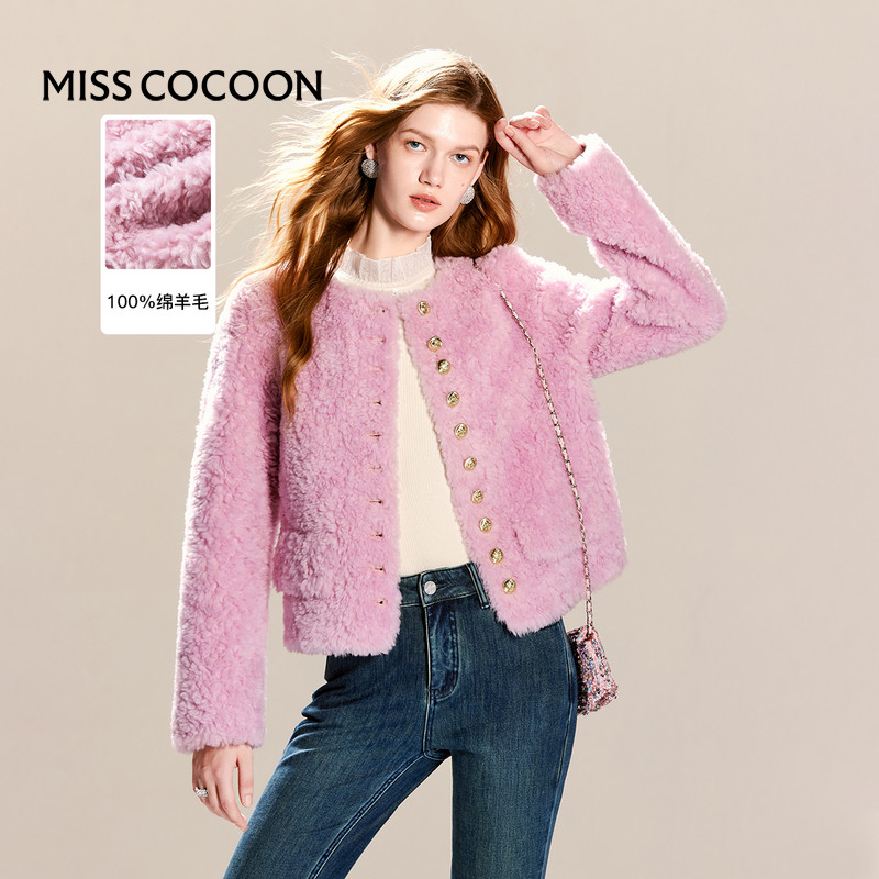 100%绵羊毛 可可尼COCOON2025冬季新款女粉色皮草高级小香风外套