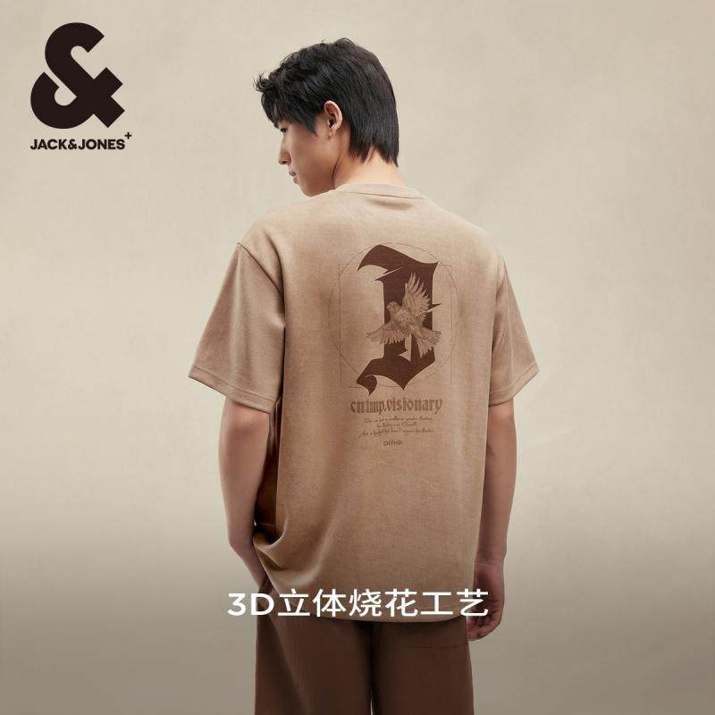【仿麂皮】杰克琼斯男士短袖T恤男装2025年新烧花飞鸟打底衫宽松