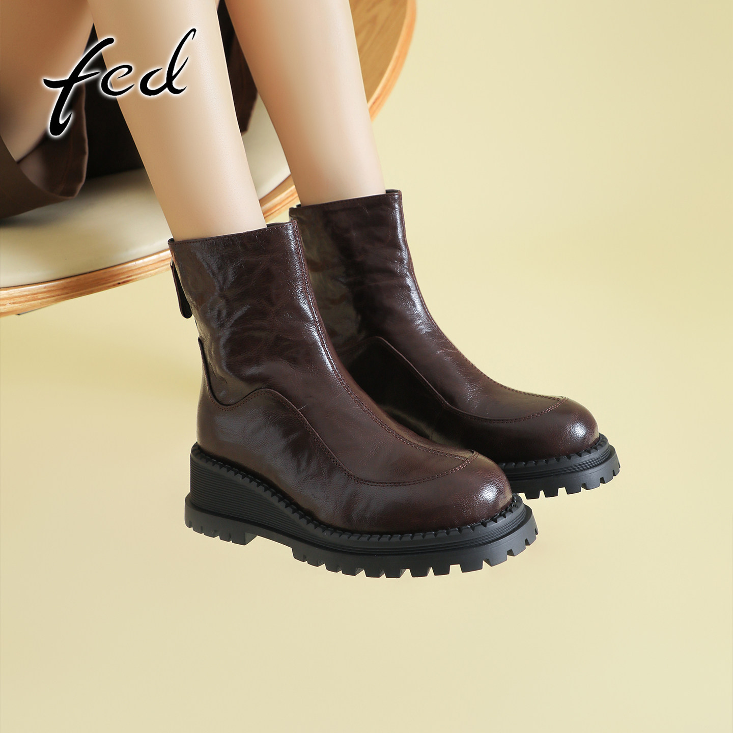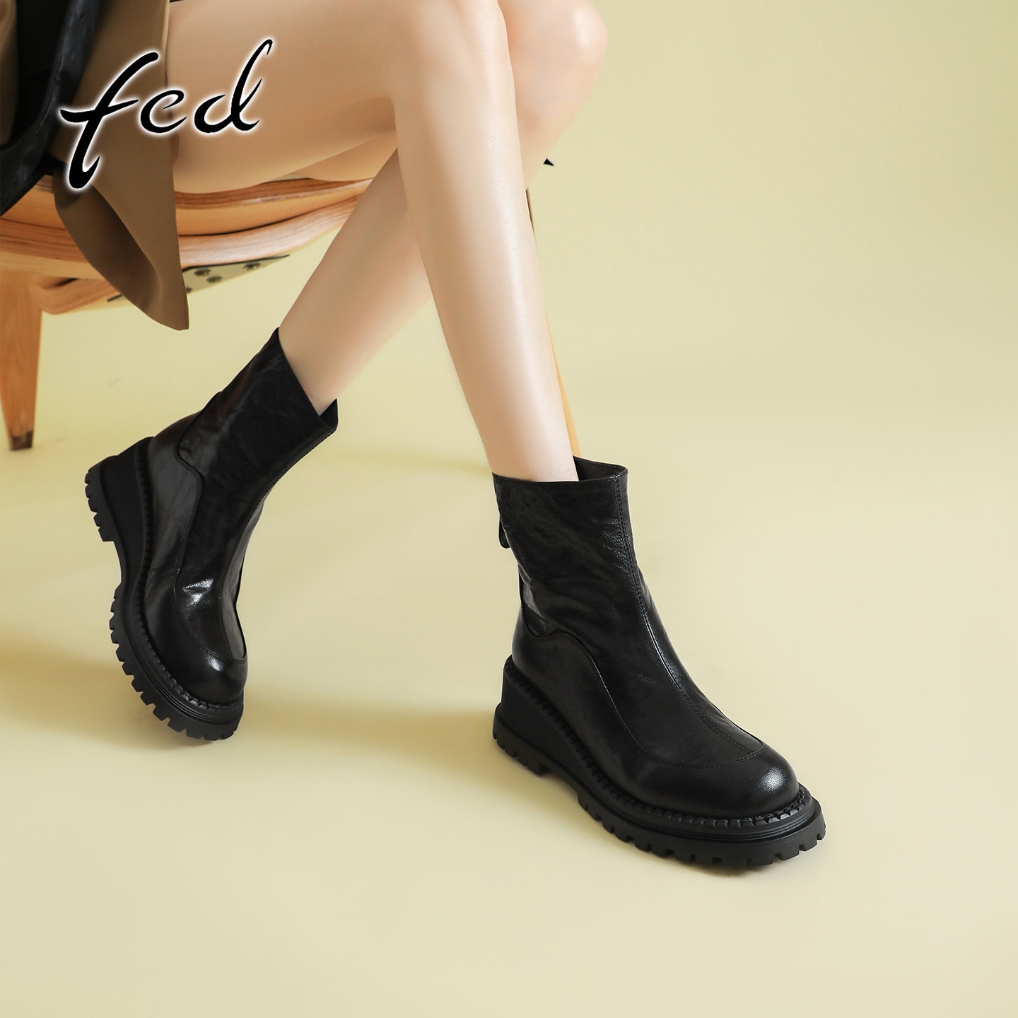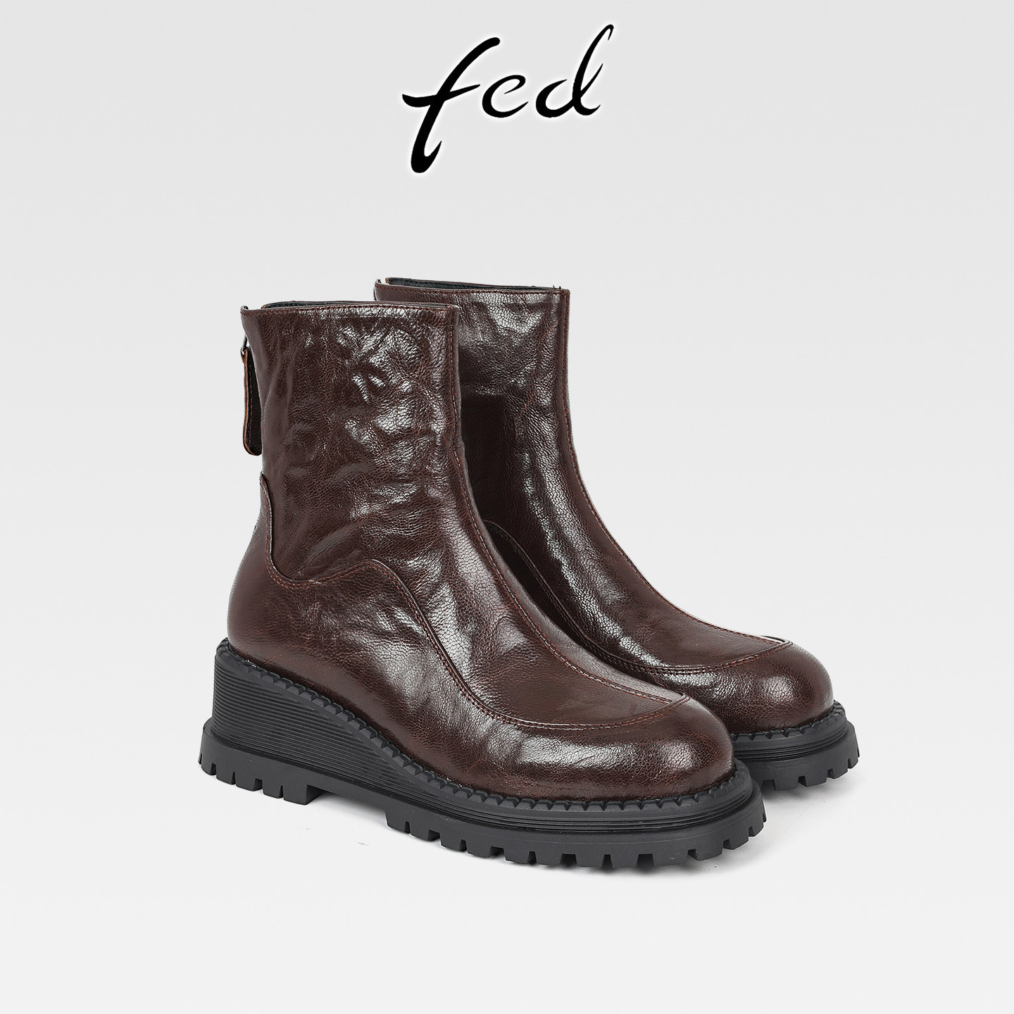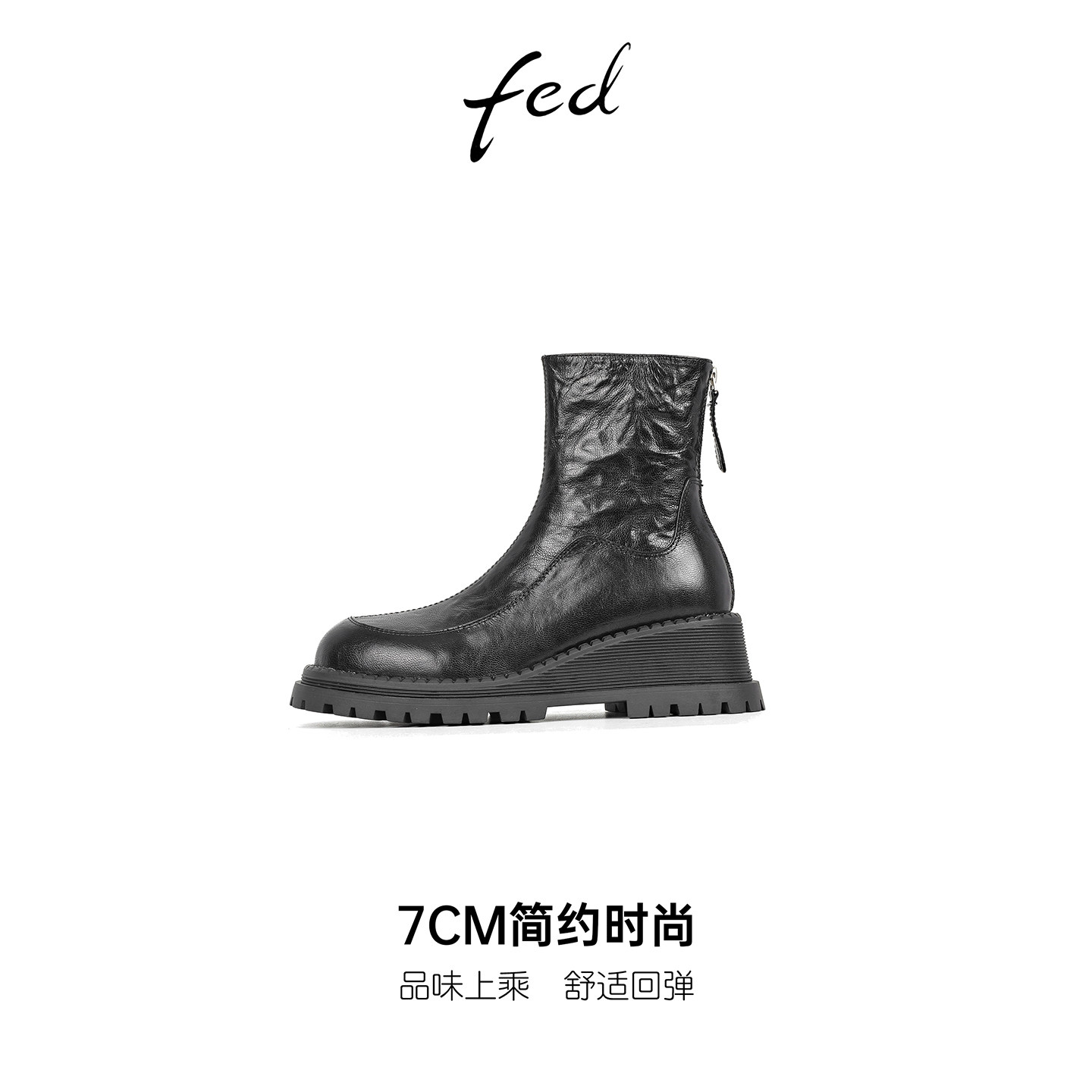 fed英伦风复古羊皮坡跟切尔西短靴女秋冬款后拉链圆头高跟马丁靴