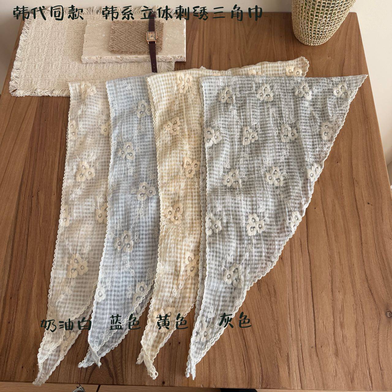 韩代同款绣花曲牙边蕾丝三角巾女夏季植物花卉棉麻多功能围巾披肩