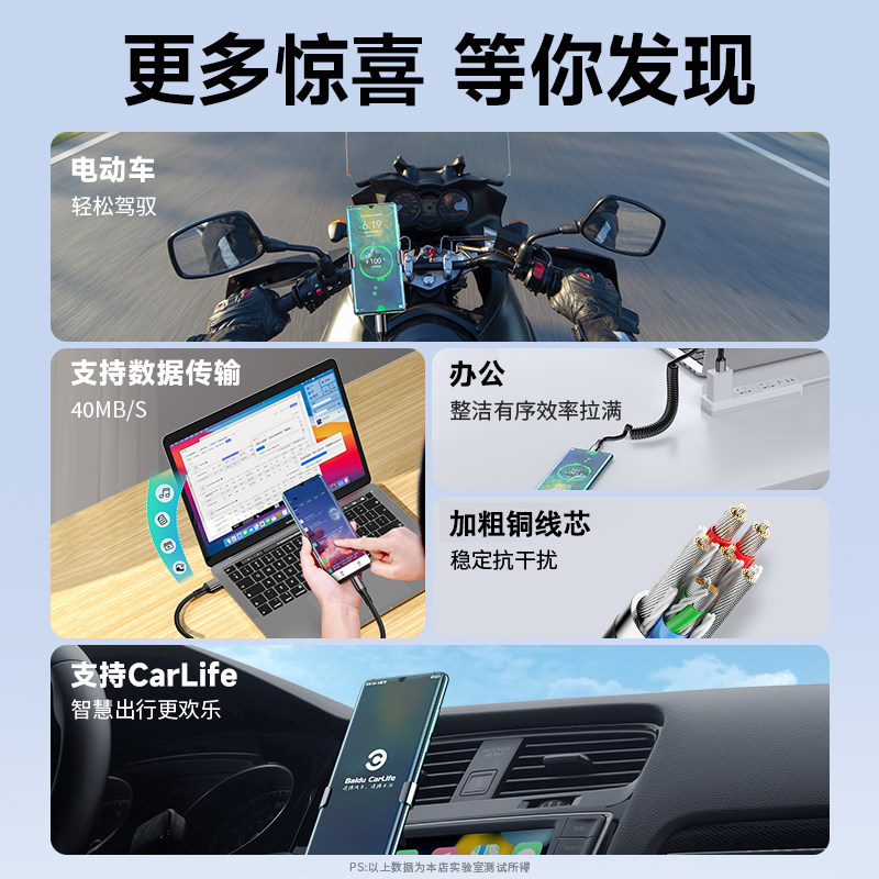 科必兴 车载carplay弹簧数据线100W超级快充双头typec适用苹果iPhone15华为mate荣耀手机充电线摩托车tpc伸缩