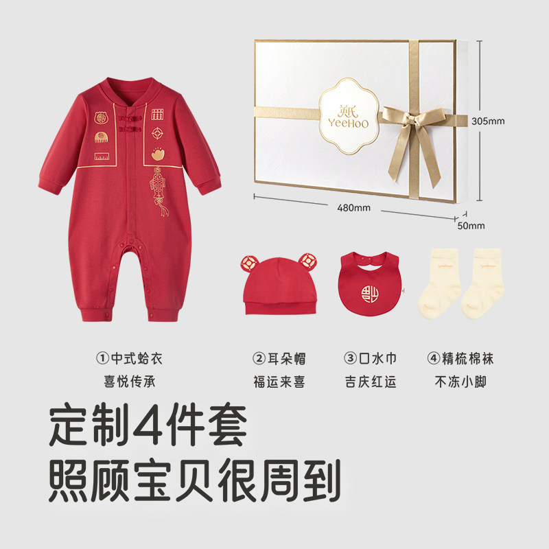 新生儿婴儿礼盒秋冬连体衣礼物满月送礼衣服红色宝宝过年拜年服