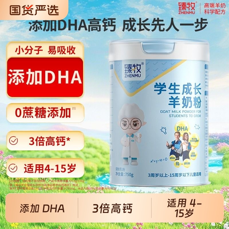 臻牧学生羊奶粉正品儿童青少年高钙成长无蔗糖4-15岁750g富硒配方