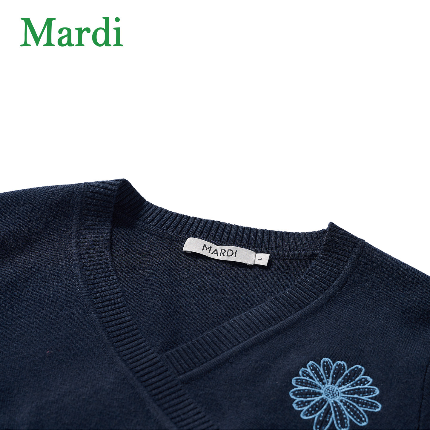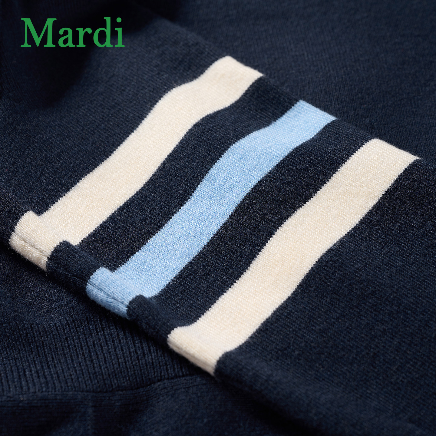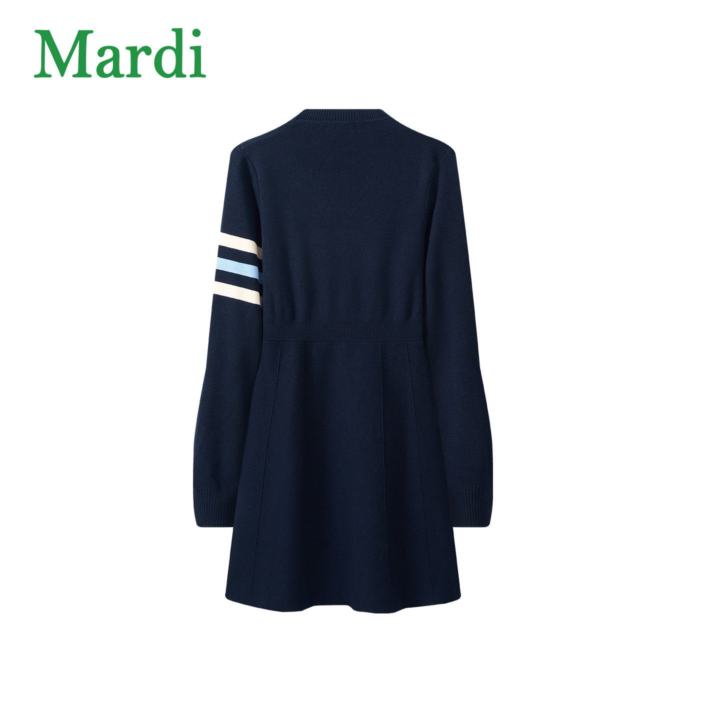 MARDI学院风针织连衣裙女撞色条纹收腰A字裙藤蓝色休闲长袖中长款