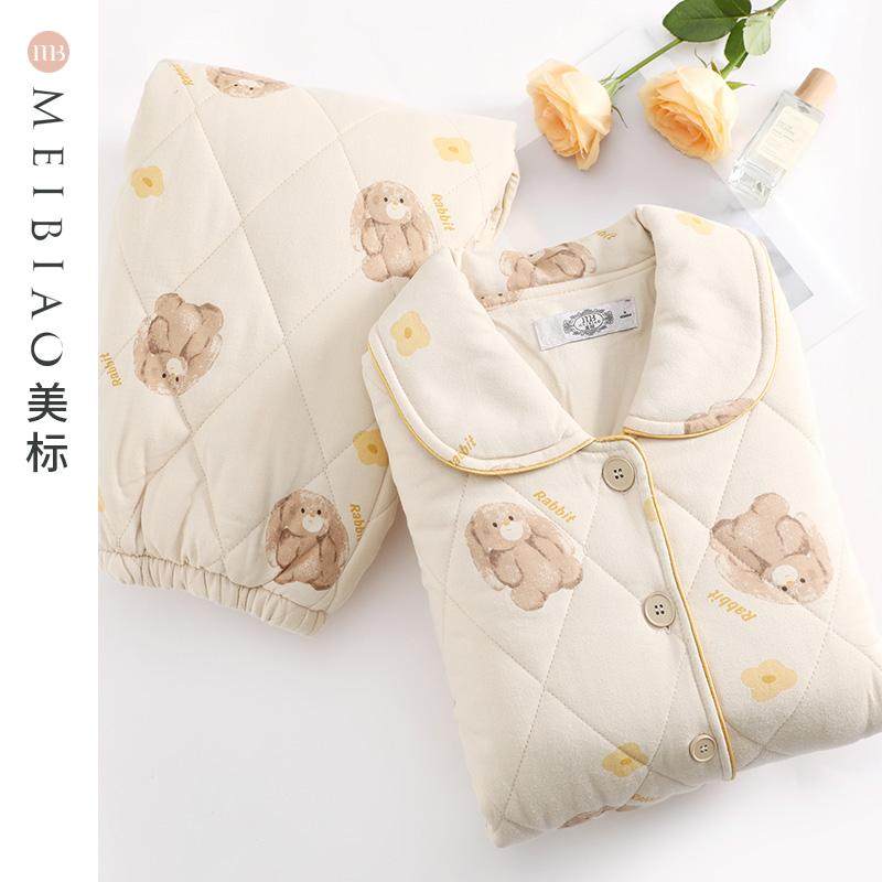 美标三层加厚夹棉纯棉睡衣套装女秋冬休闲卡通全棉质可外穿家居服