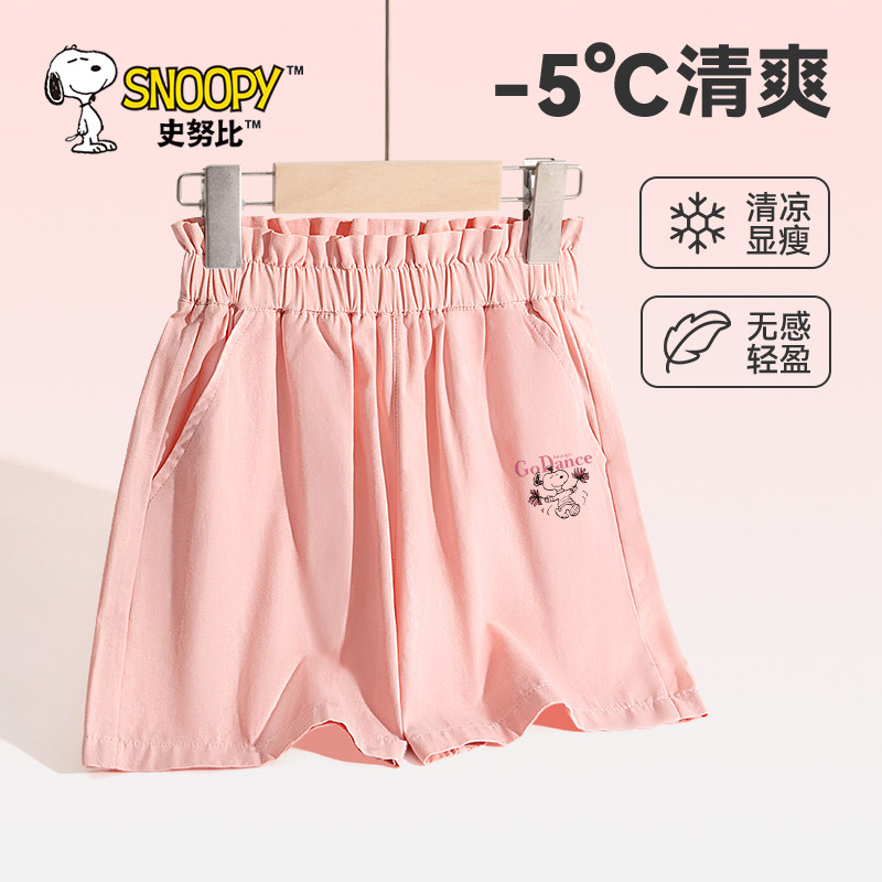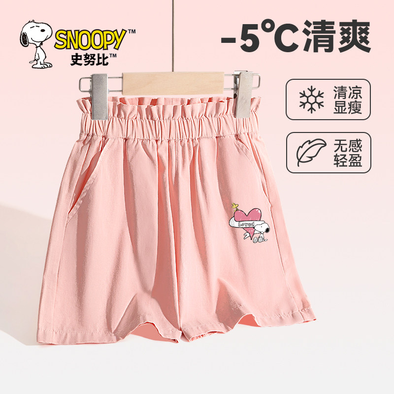 史努比女童纯棉短裤女大童洋气粉色花苞腰五分裤儿童薄款夏装裤子