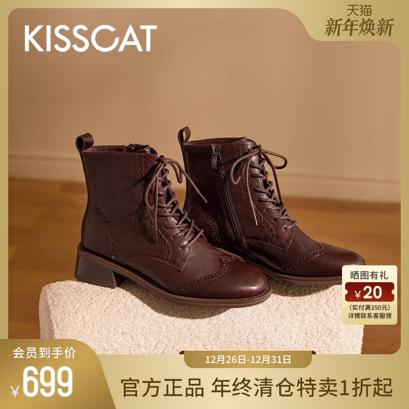 接吻猫[黑胶唱片马丁靴]女新款布洛克短靴复古粗跟水洗牛皮时装靴