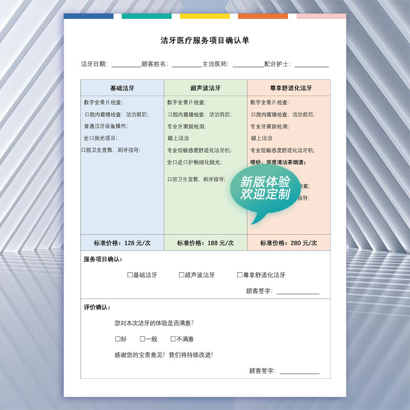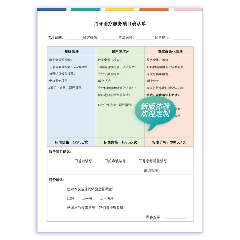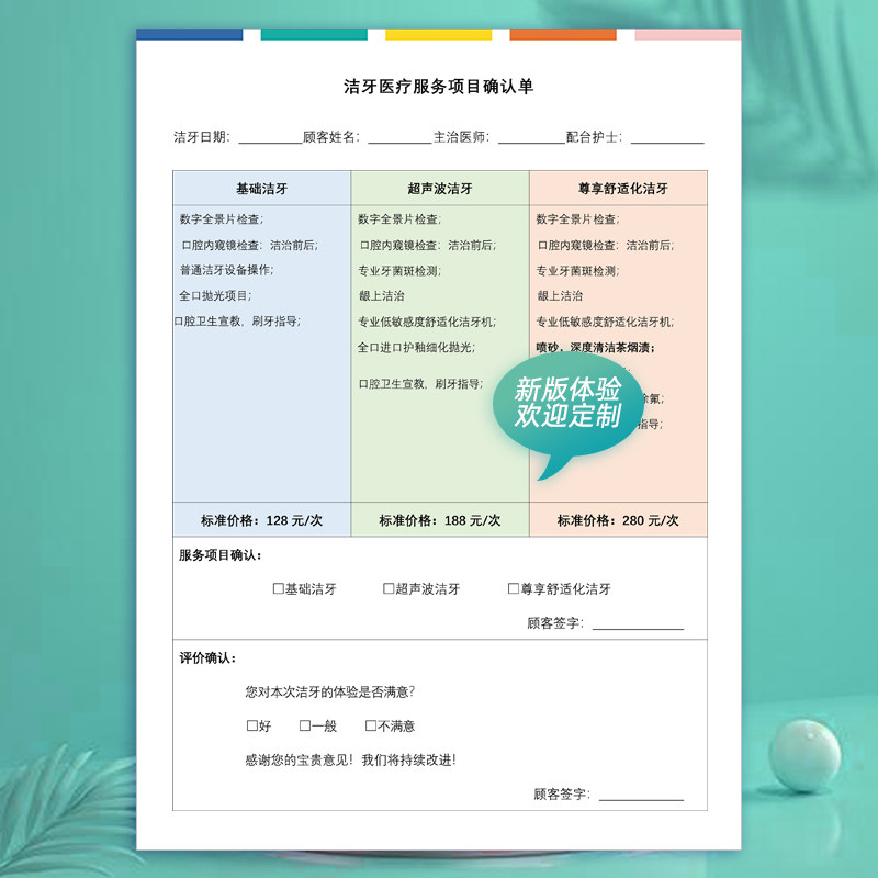 洁牙医疗服务项目确认单A4彩色美白嵌体洗牙牙周护理单文书新款