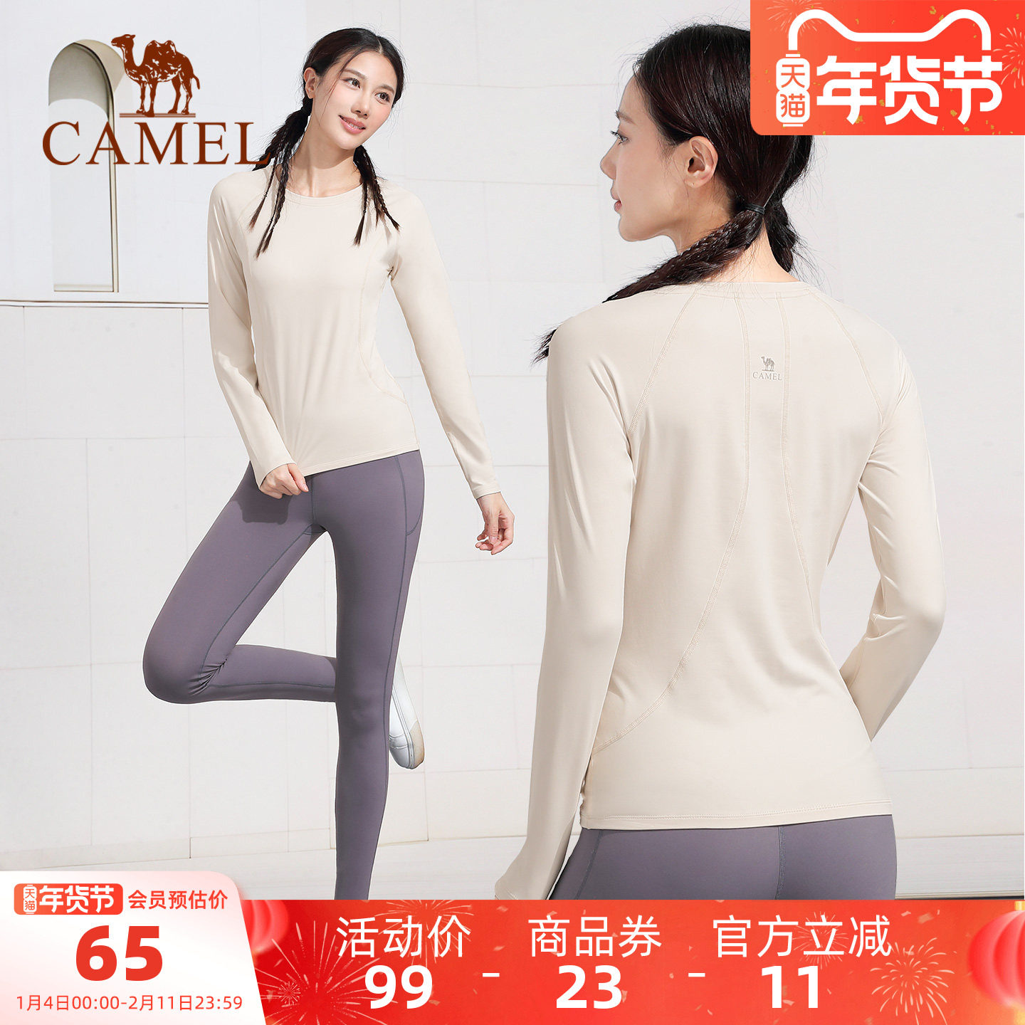 骆驼瑜伽T恤女2025年秋冬保暖运动上衣圆领修身加绒休闲针织长袖