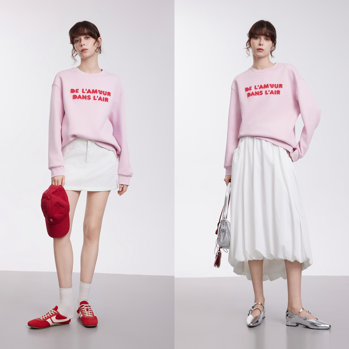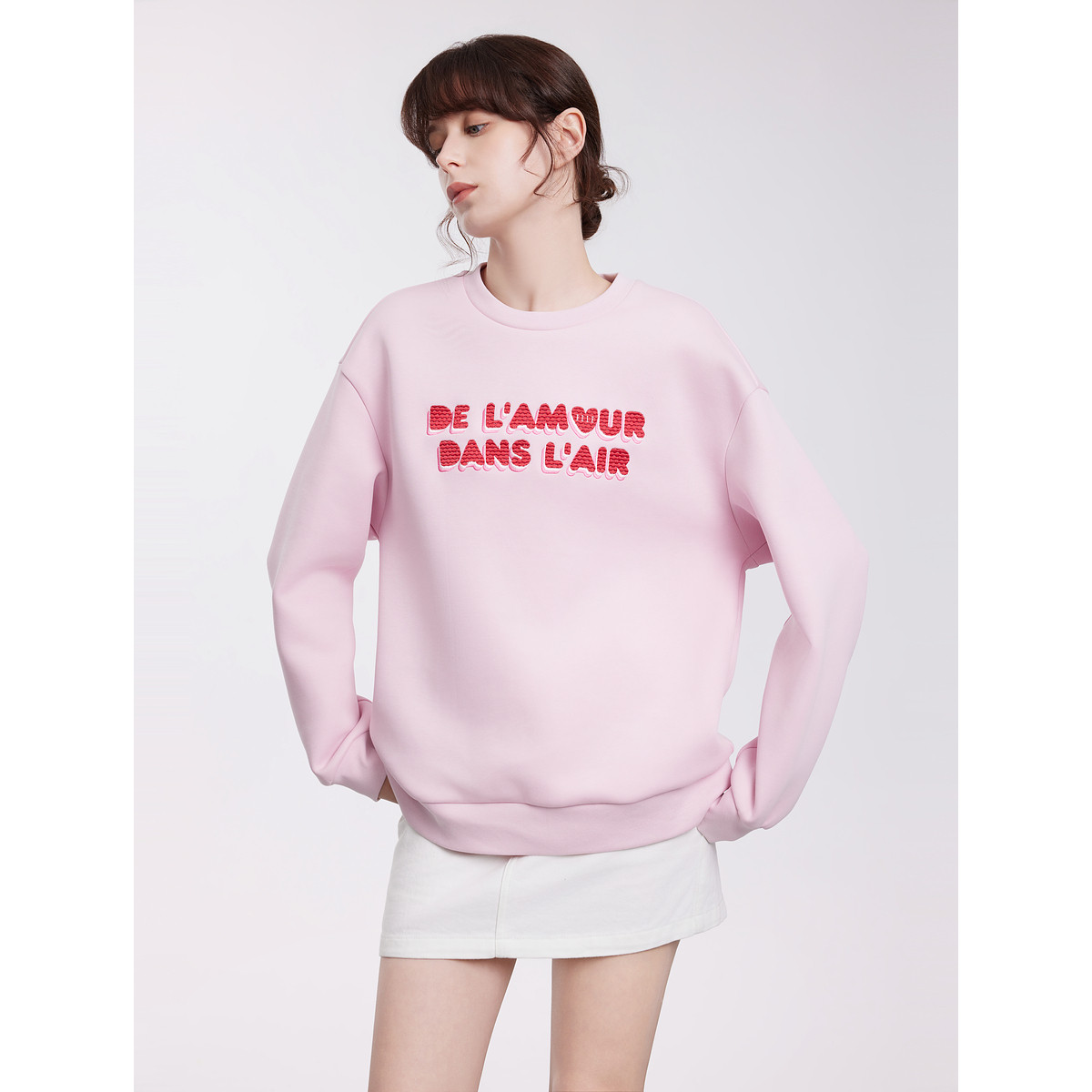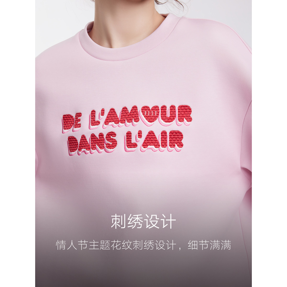 ELLE粉色浪漫刺绣圆领长袖卫衣女2025秋季新款套头时髦优雅上衣