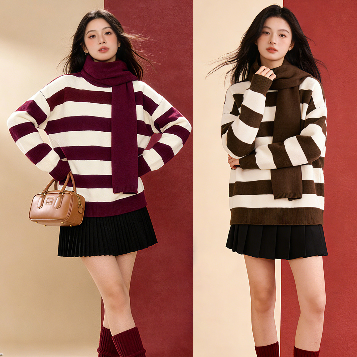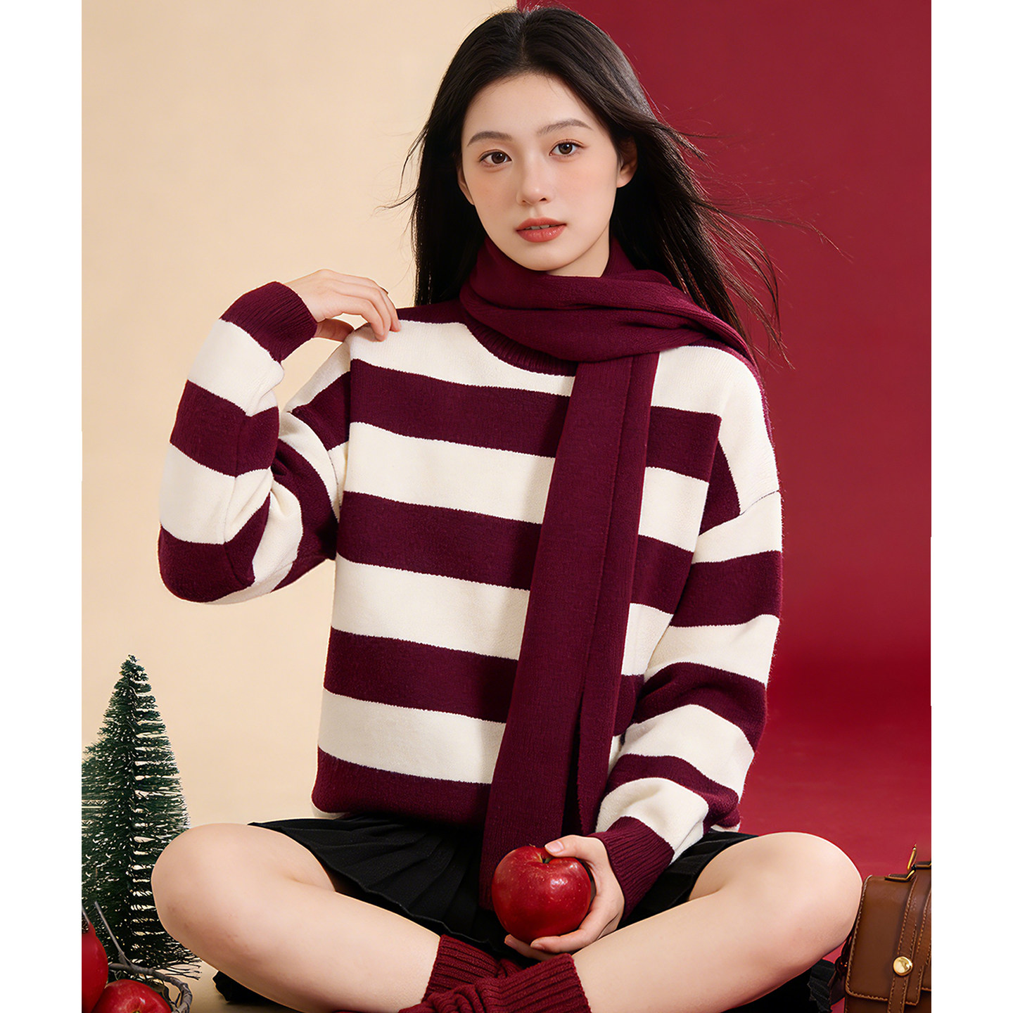 雪中飞红色条纹针织衫女2026可拆卸围脖毛衣马年新年氛围感穿搭PC