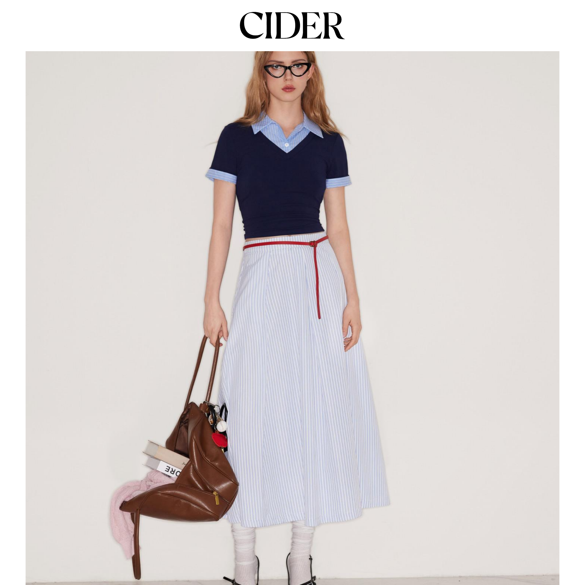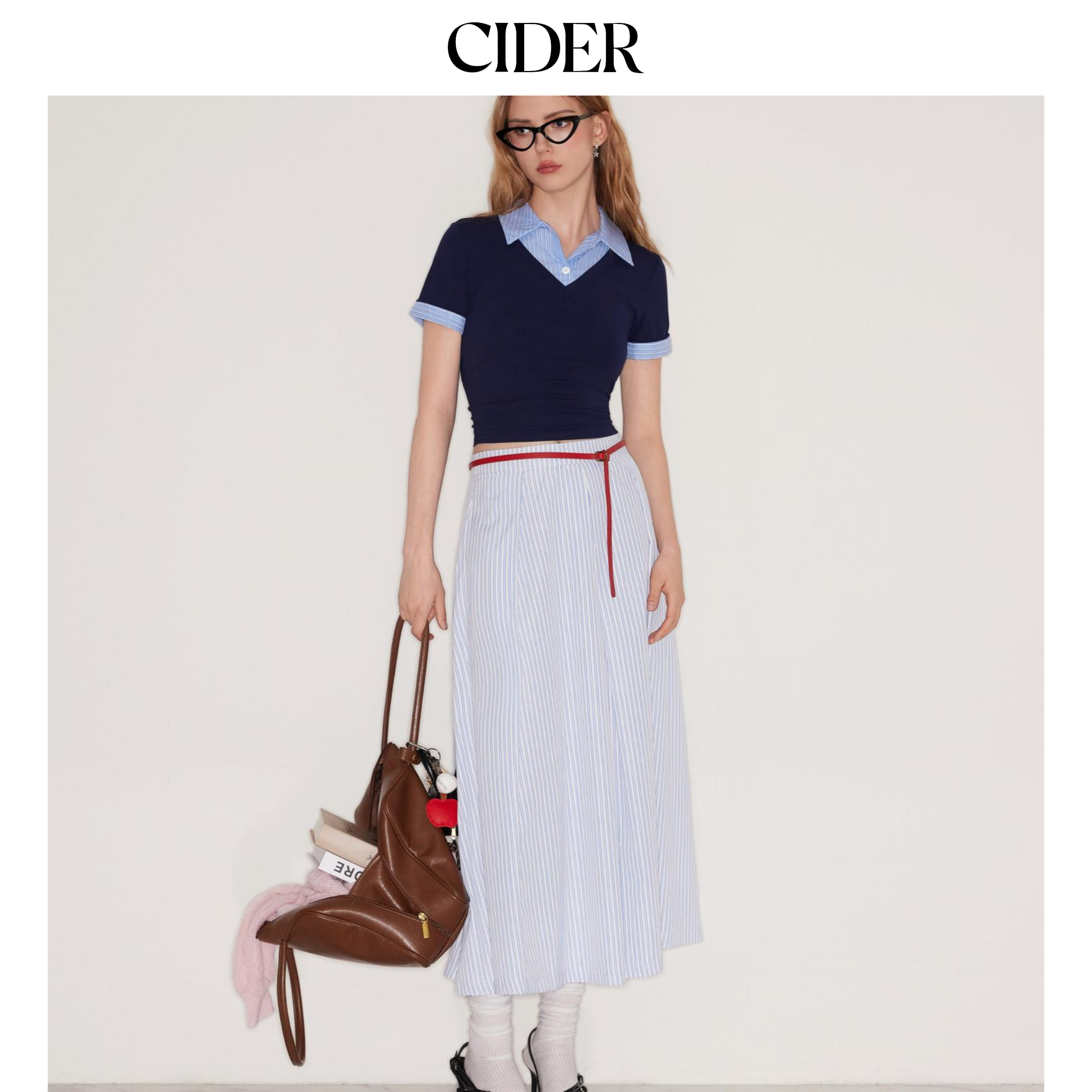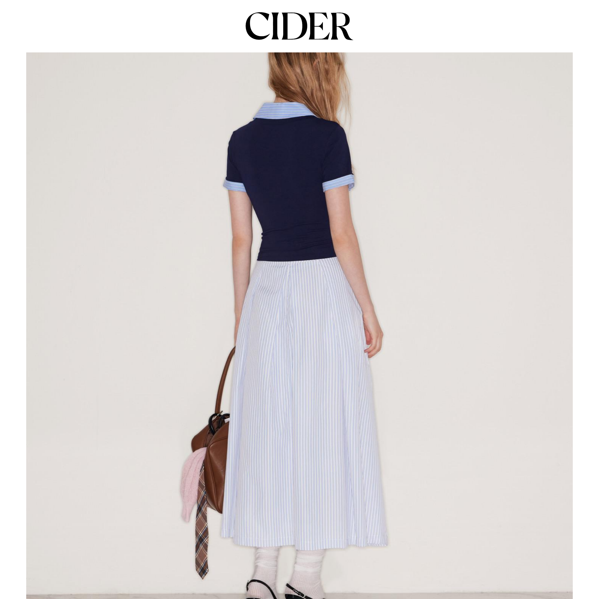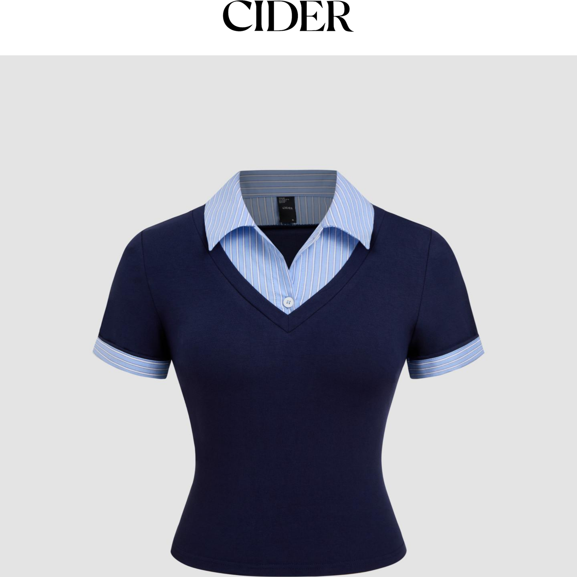 【明星同款】CIDER 正品假两件条纹翻领学院风短袖上衣114478204