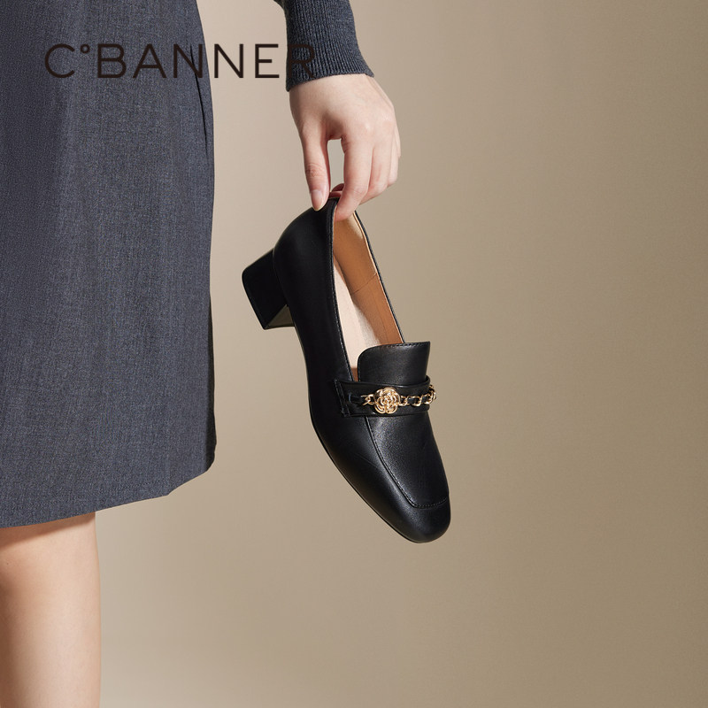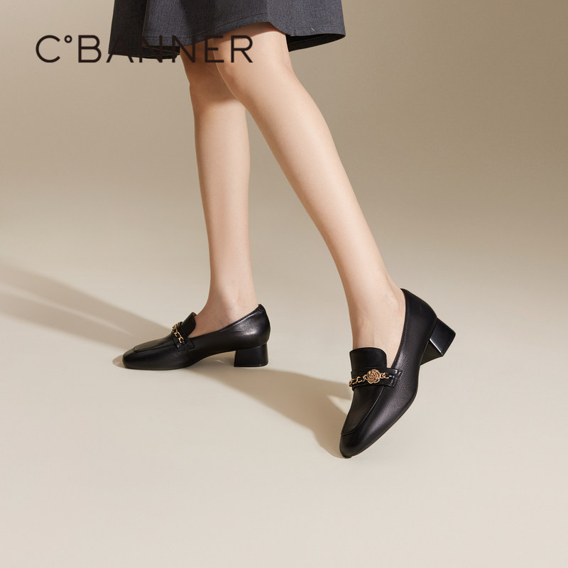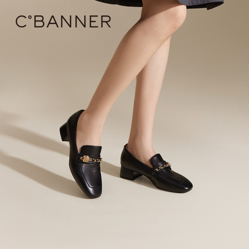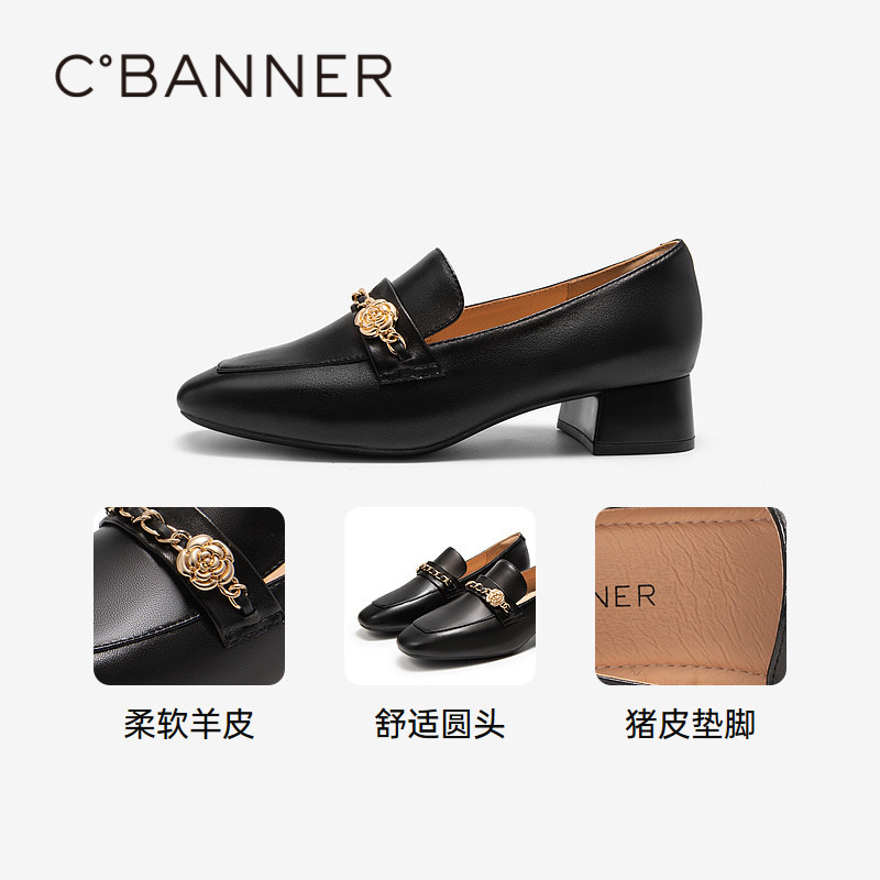 千百度羊皮粗中跟乐福鞋女秋季新款通勤通勤小皮鞋真皮单鞋