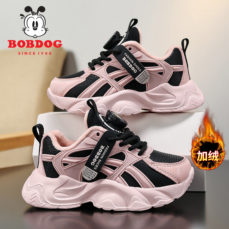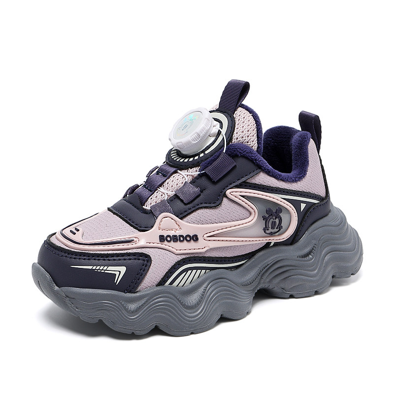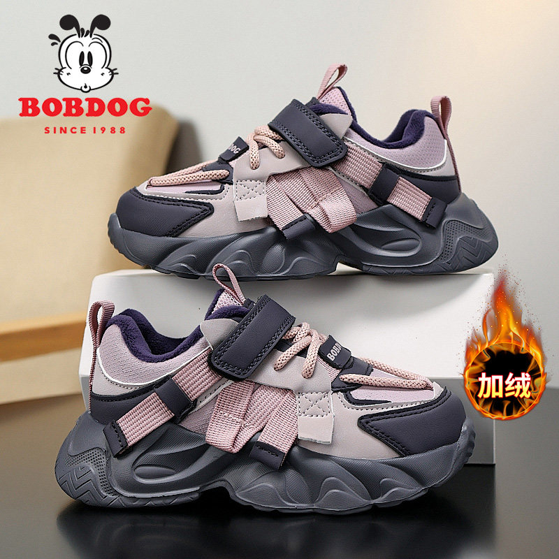 巴布豆女童冬季加绒运动鞋保暖皮面儿童老爹鞋轻便旋转童鞋防水