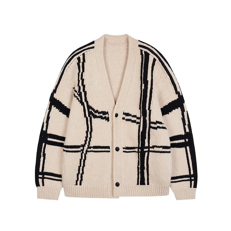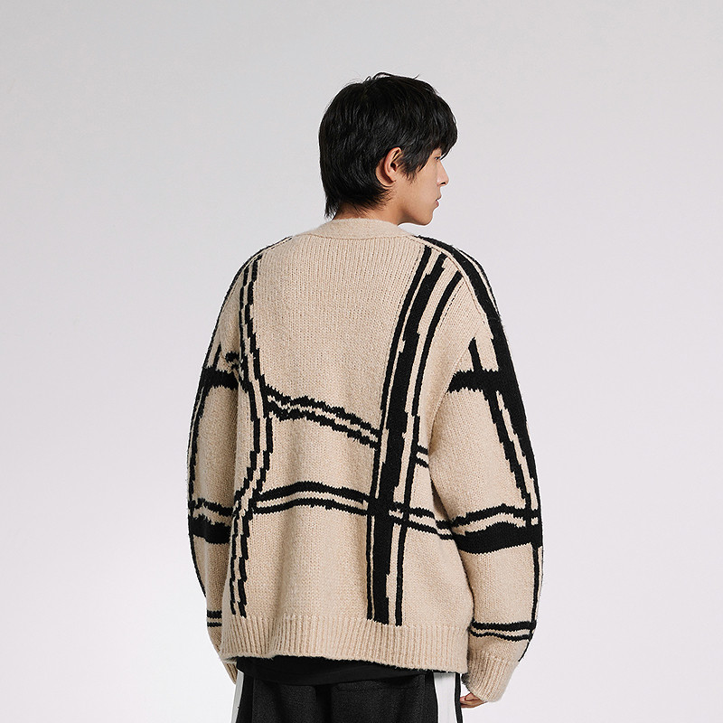 速写男装秋季新款毛衫宽松开襟V领拼色潮流时尚休闲设计毛衣外套