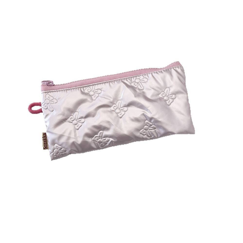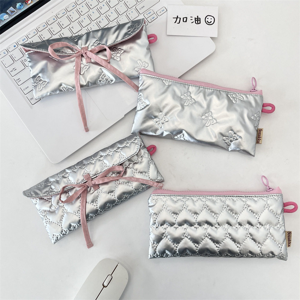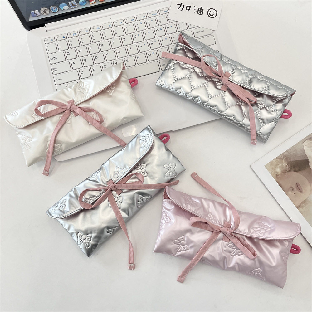 绗缝蝴蝶结翻盖笔袋零钱包女便携收纳袋多功能学生文具盒