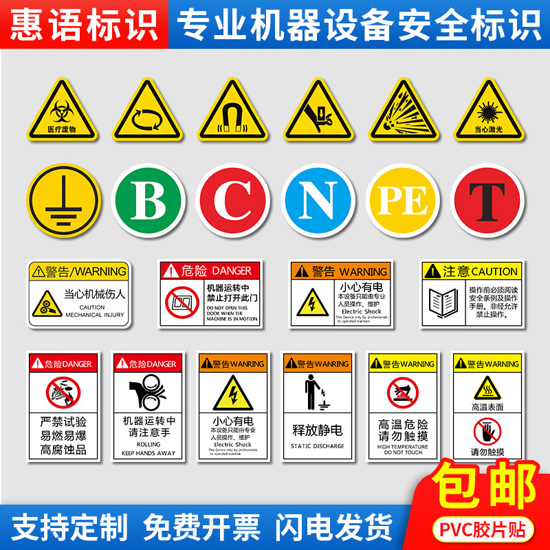 三角形设备安全标识牌标志当心触电机械CNC机床伤害警告PVC提示牌