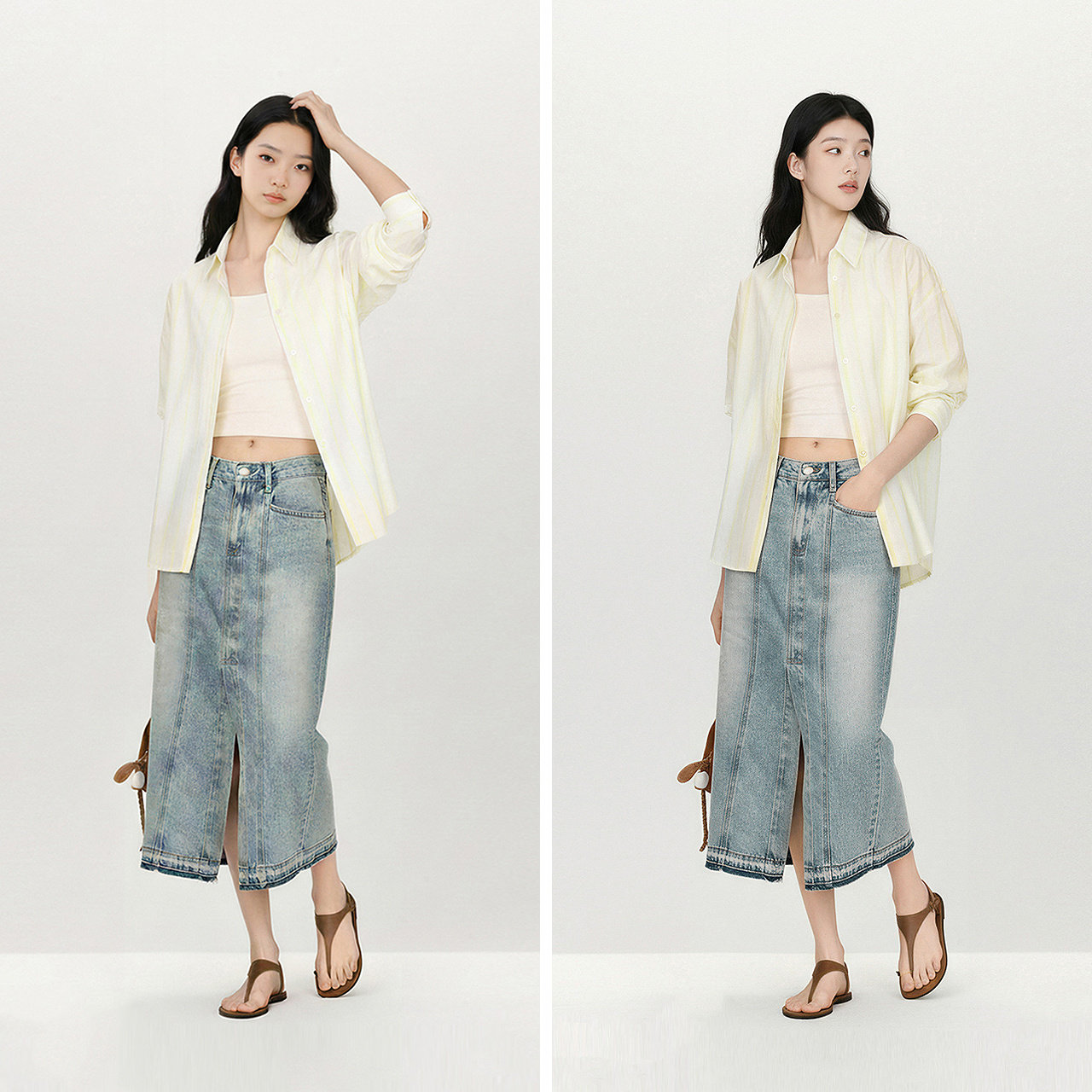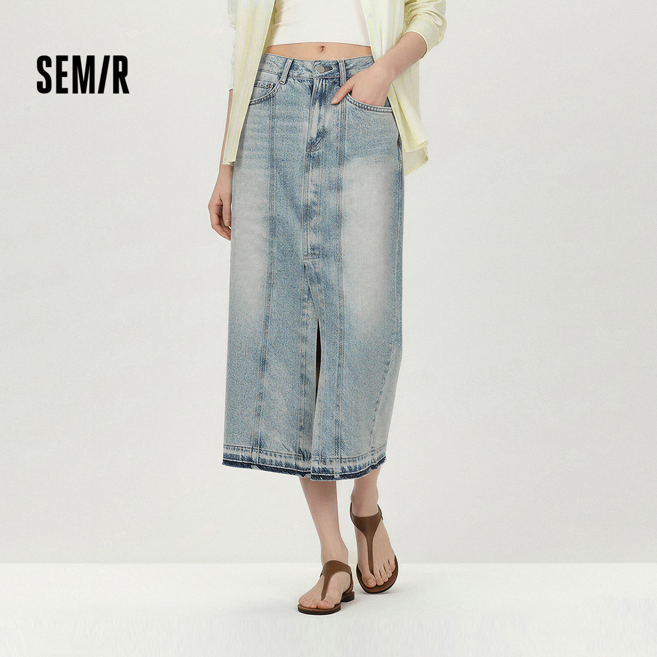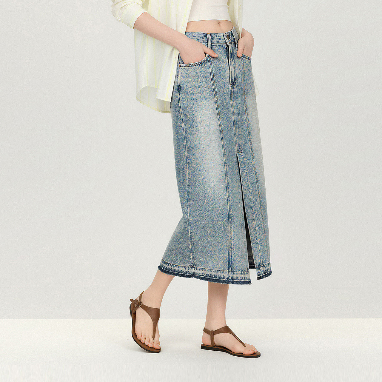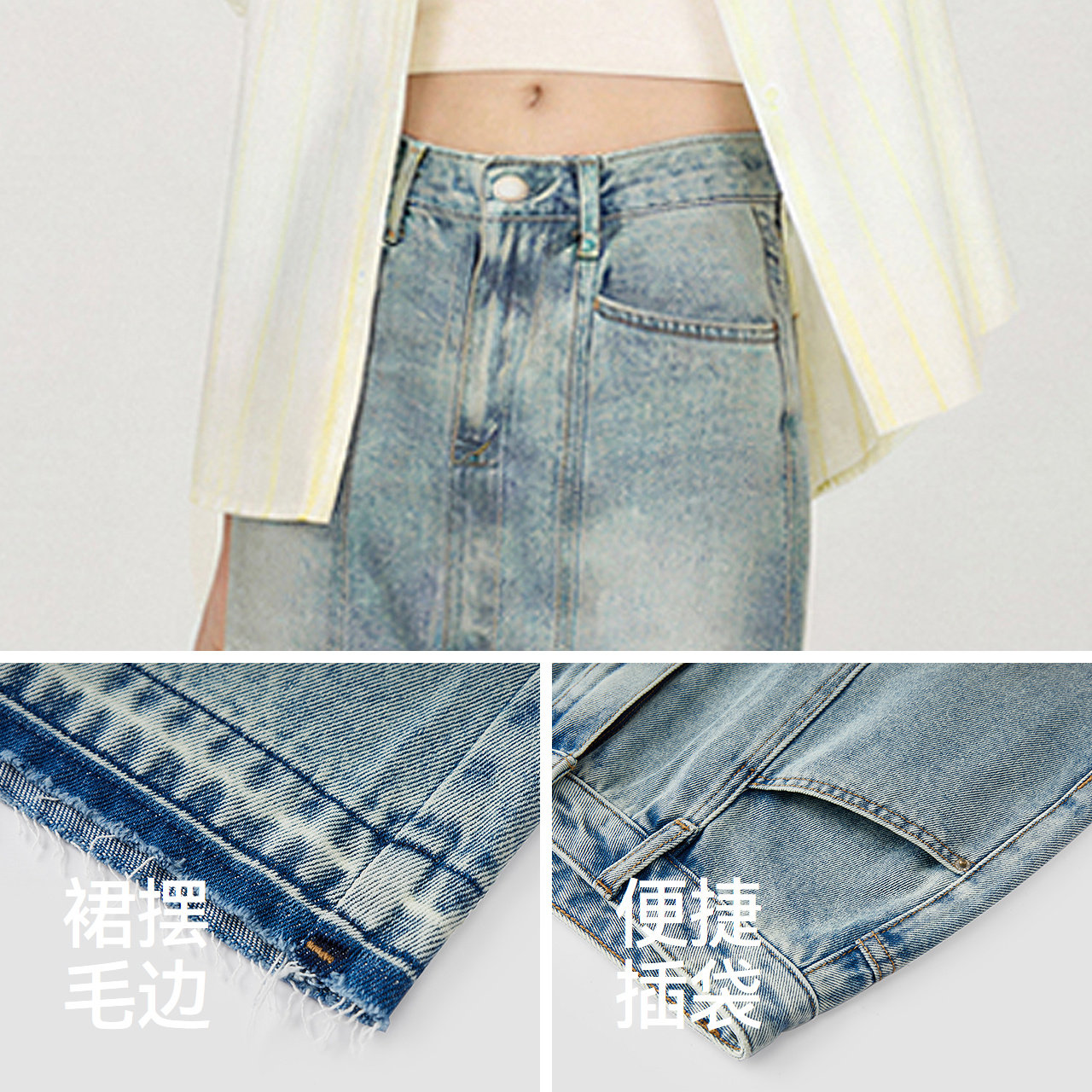 森柔|森马牛仔半身裙女春分割开叉毛边长裙显瘦酷飒风街头直筒裙