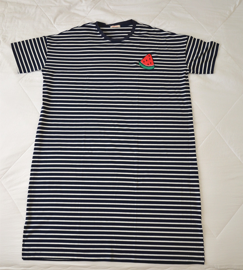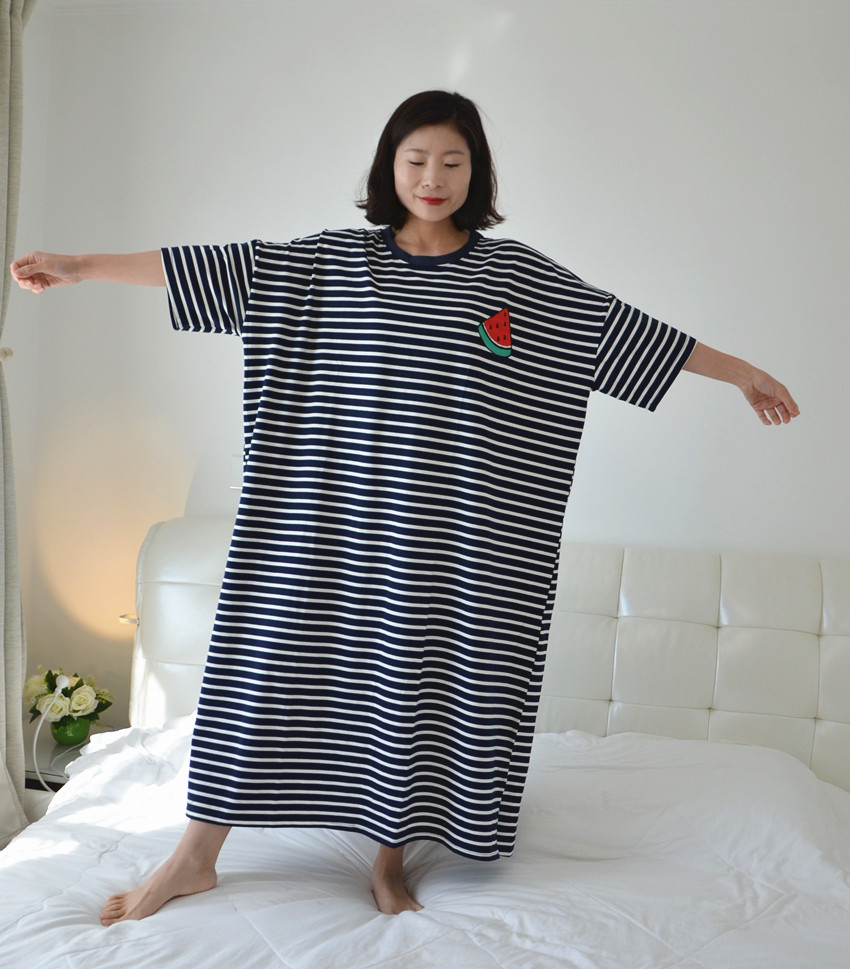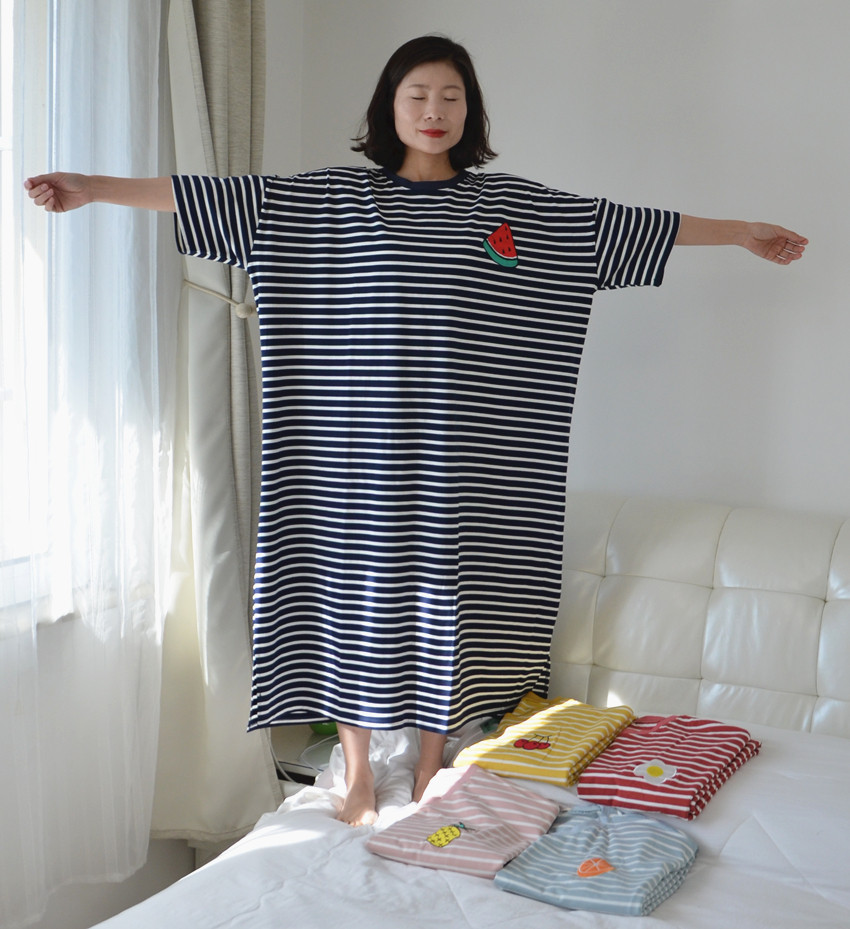 条纹水果睡裙女夏季薄纯棉短袖加长款大码胖MM孕妇200斤宽松睡衣