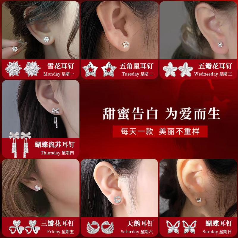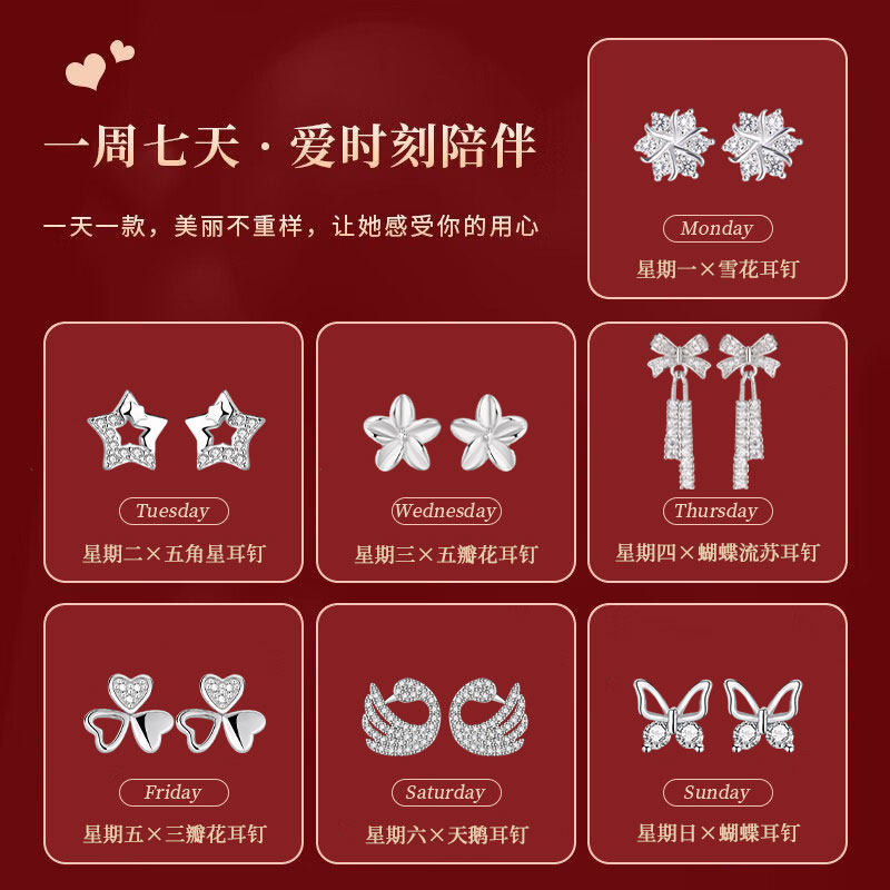s925纯银针一周耳钉女套装耳环礼盒情人节生日礼物老婆山茶花新款