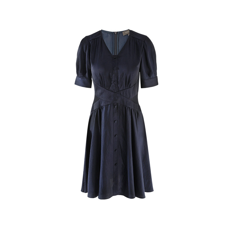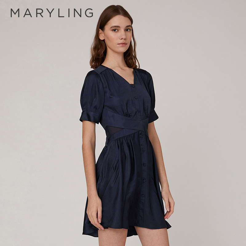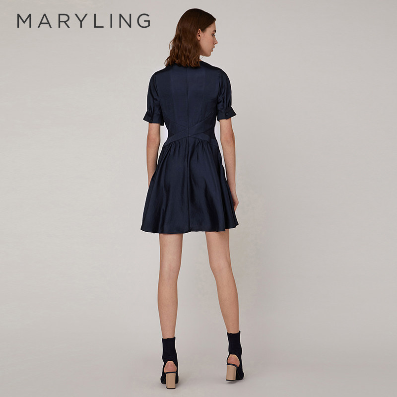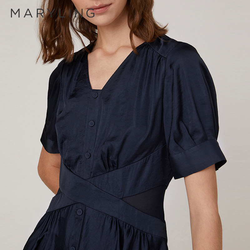 MARYLING玛俪琳夏季V领碎褶泡泡袖深蓝连衣裙A1CCW62450