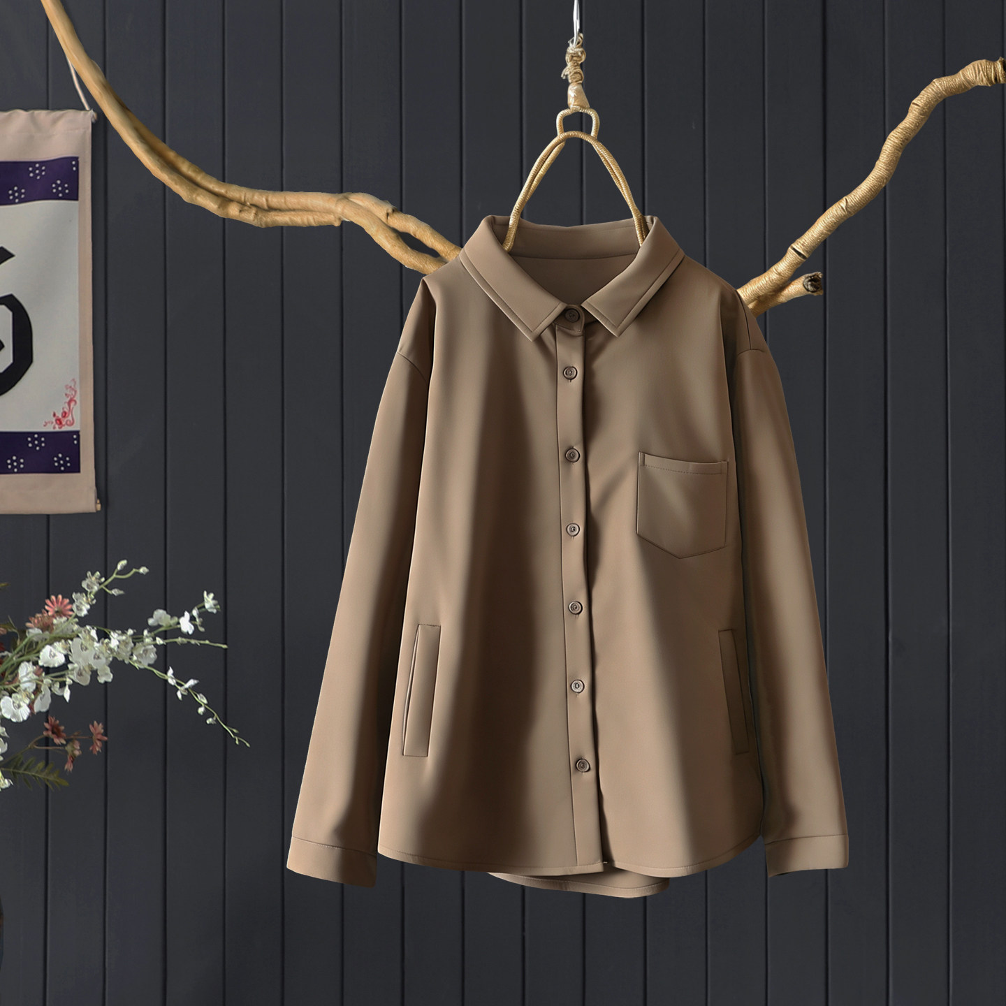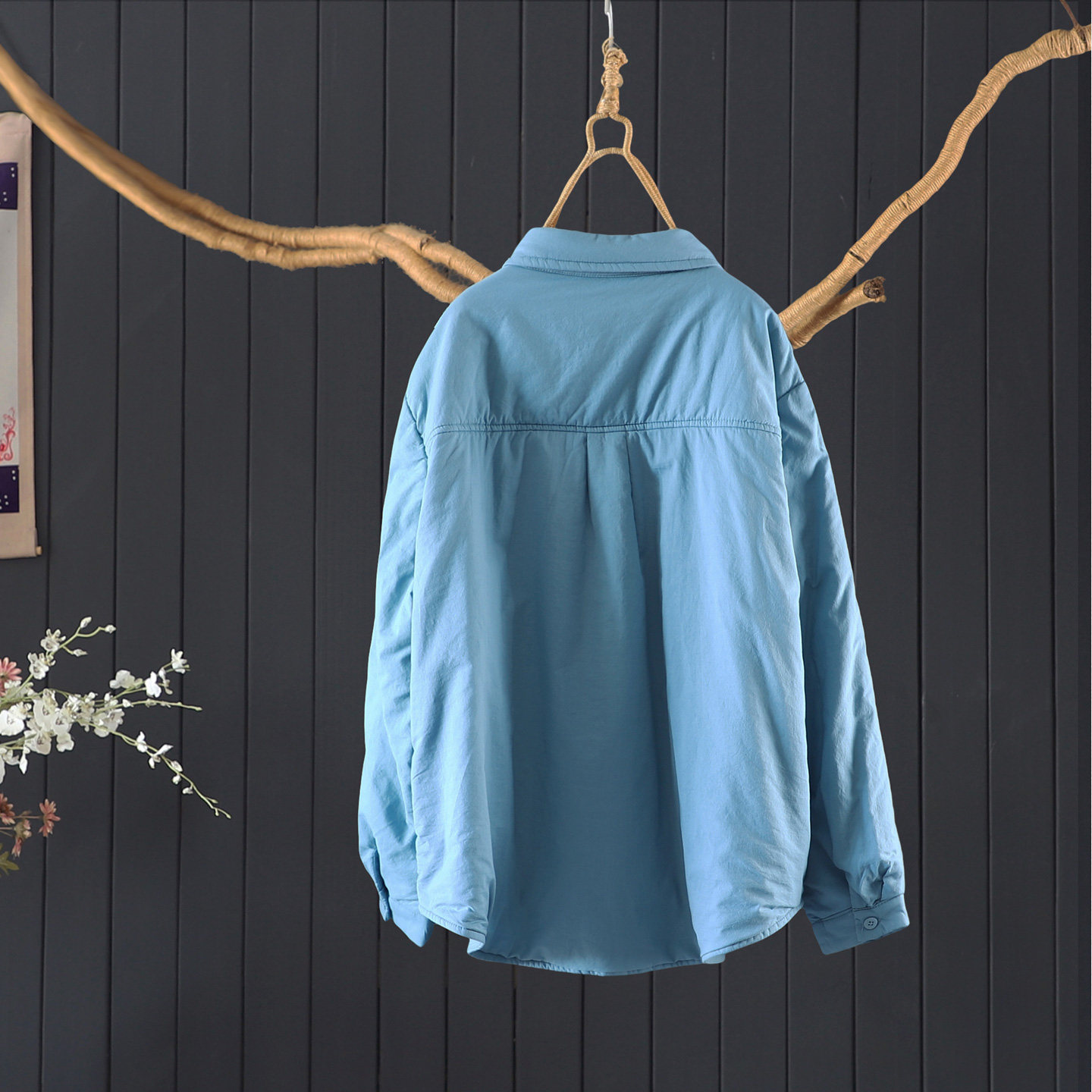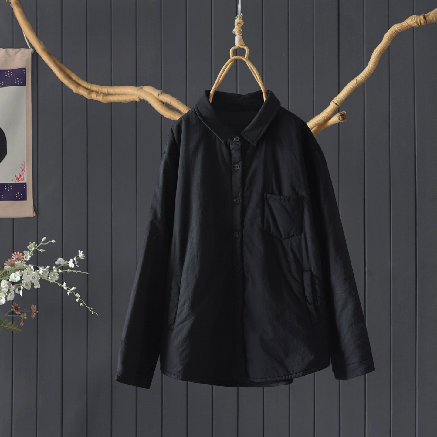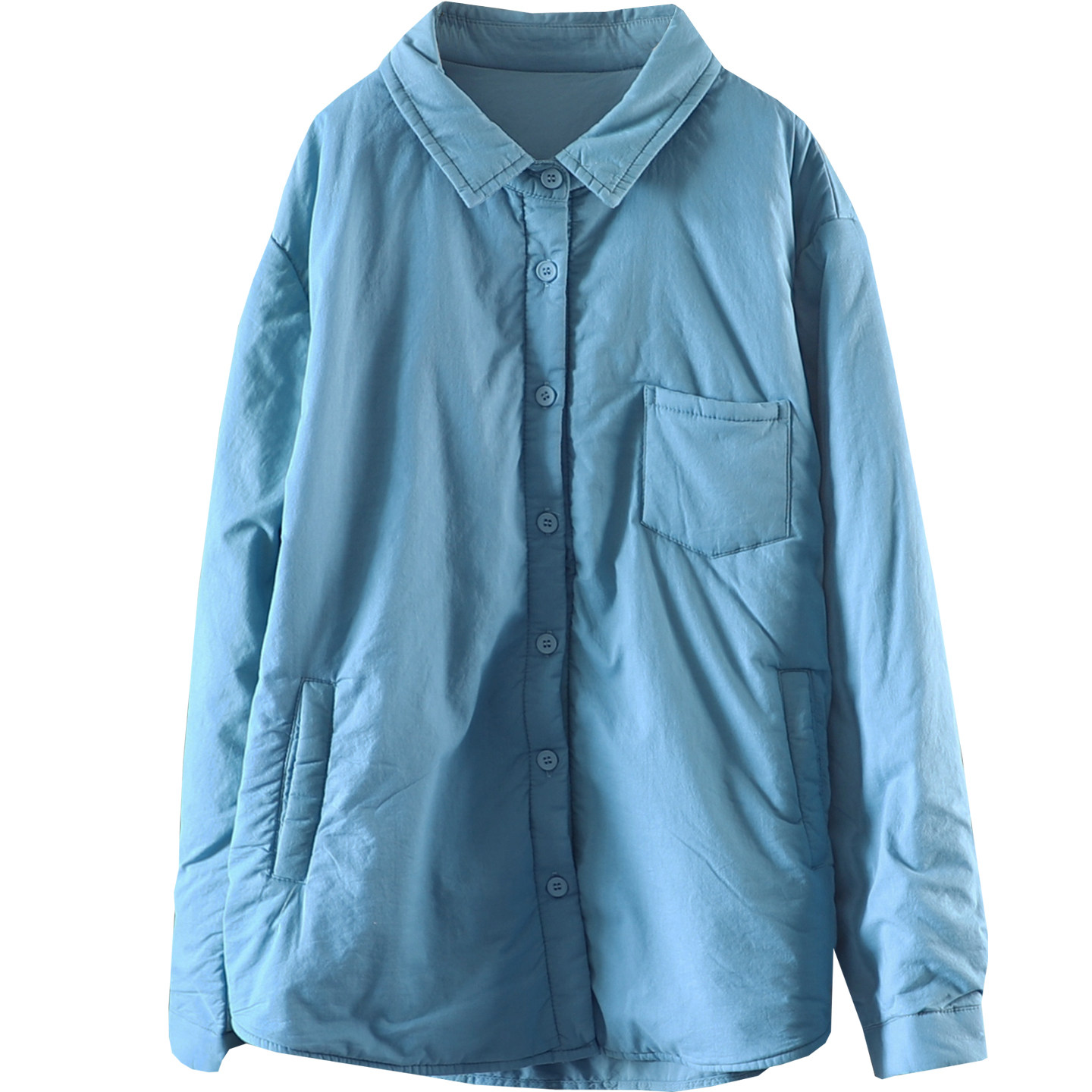 冬季宽松文艺翻领长袖夹棉款100%棉衬衫女士通勤百搭纯色棉服上衣