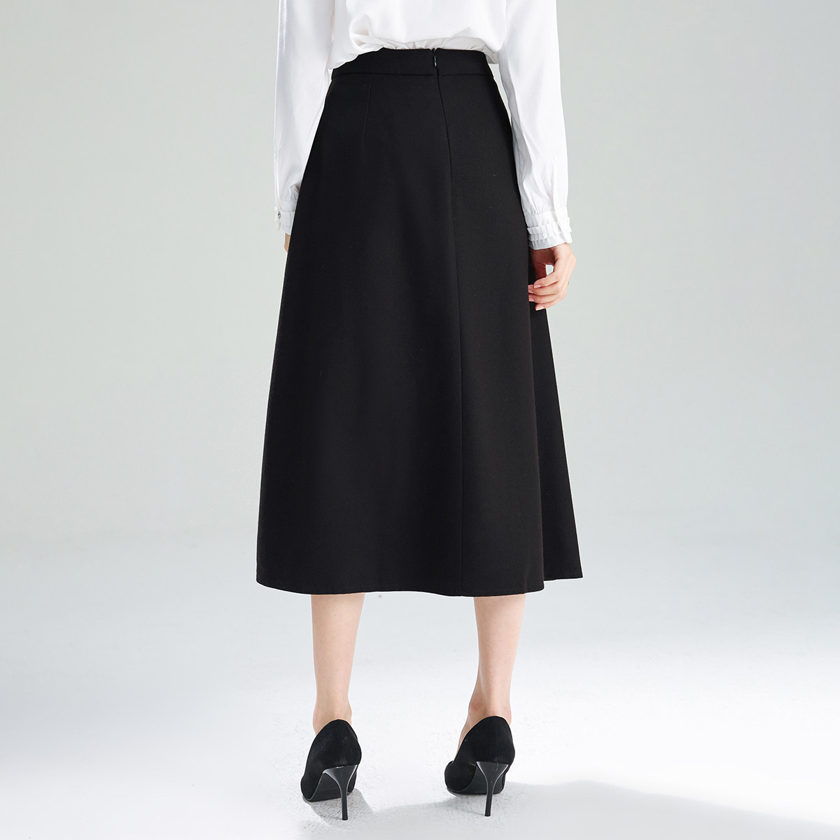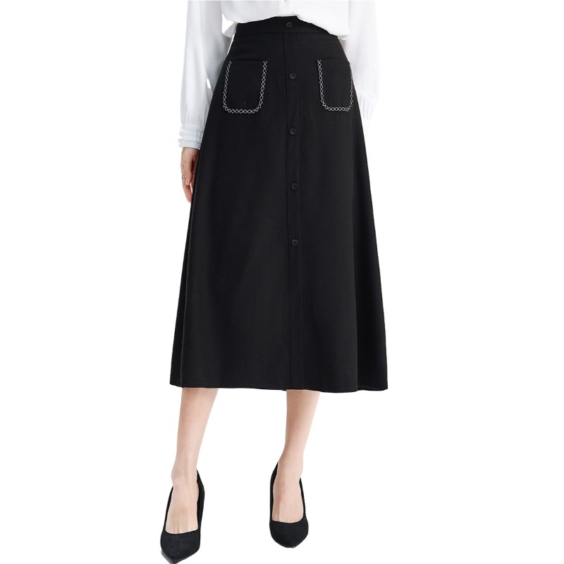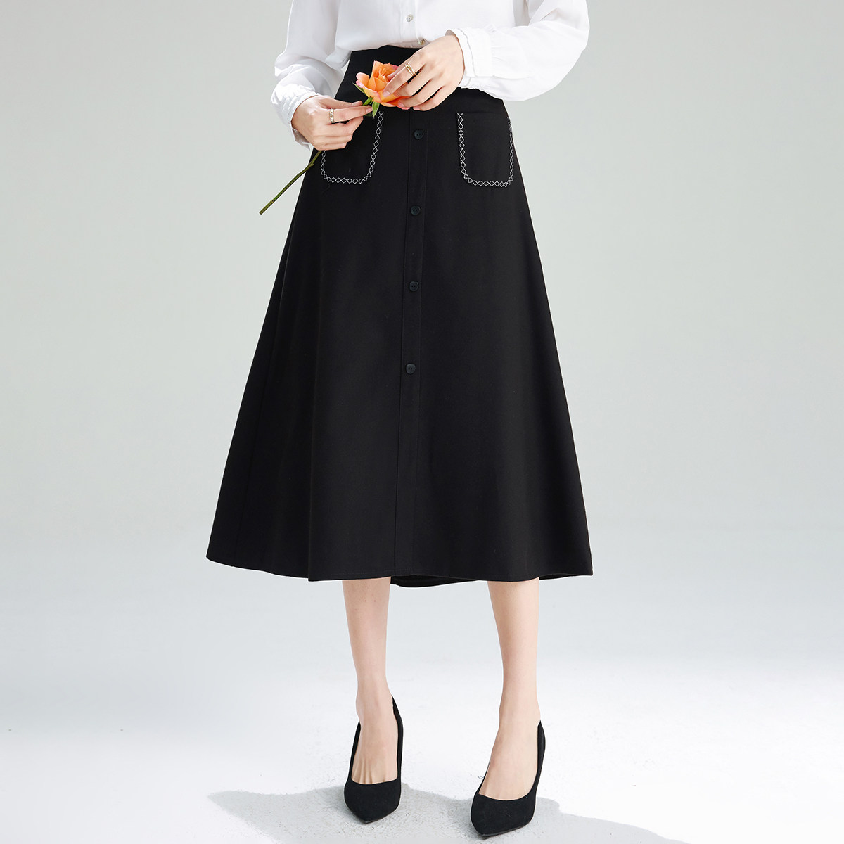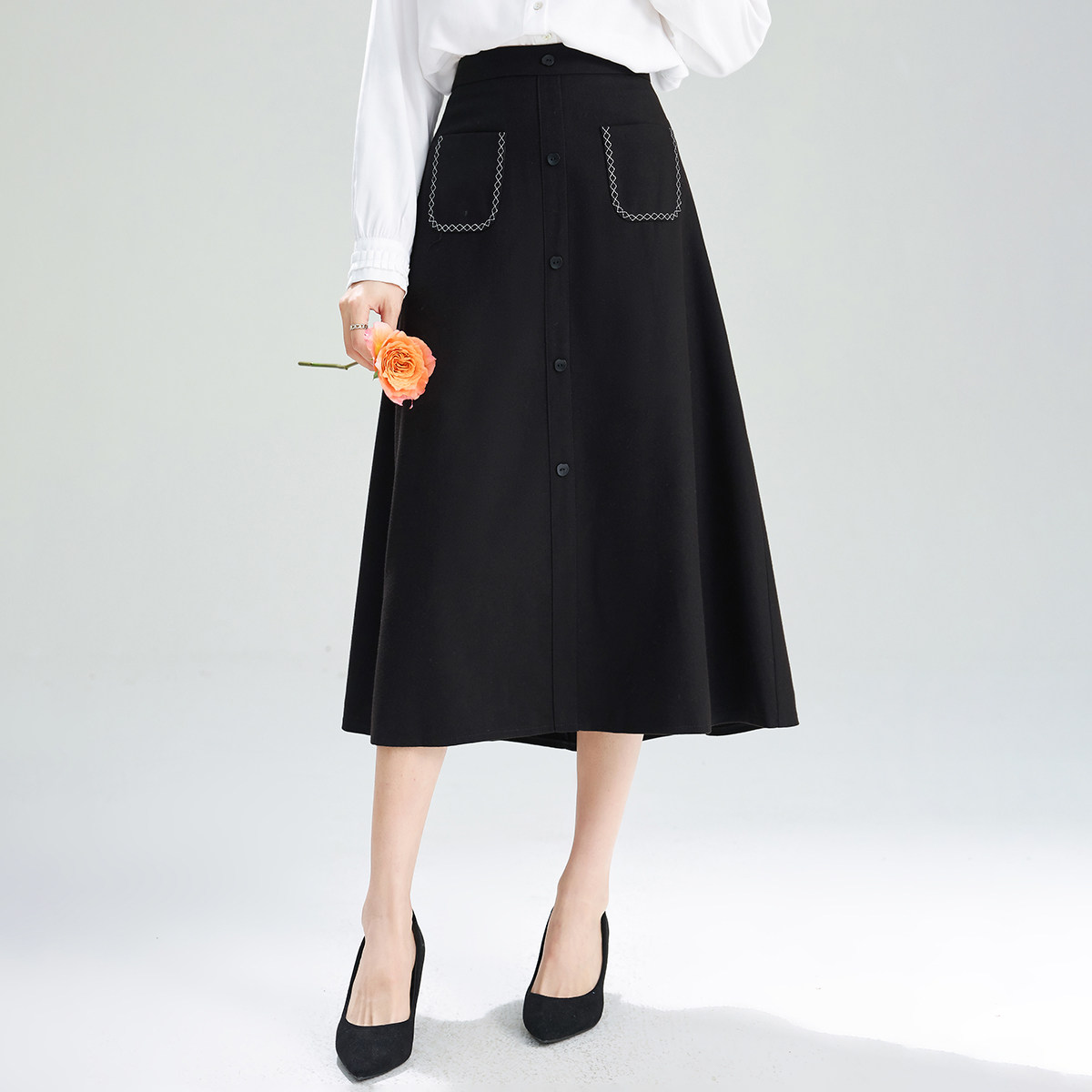 Smen诗萌OL高腰A字裙2025秋冬女士修身显瘦纯色排扣中长款半身裙