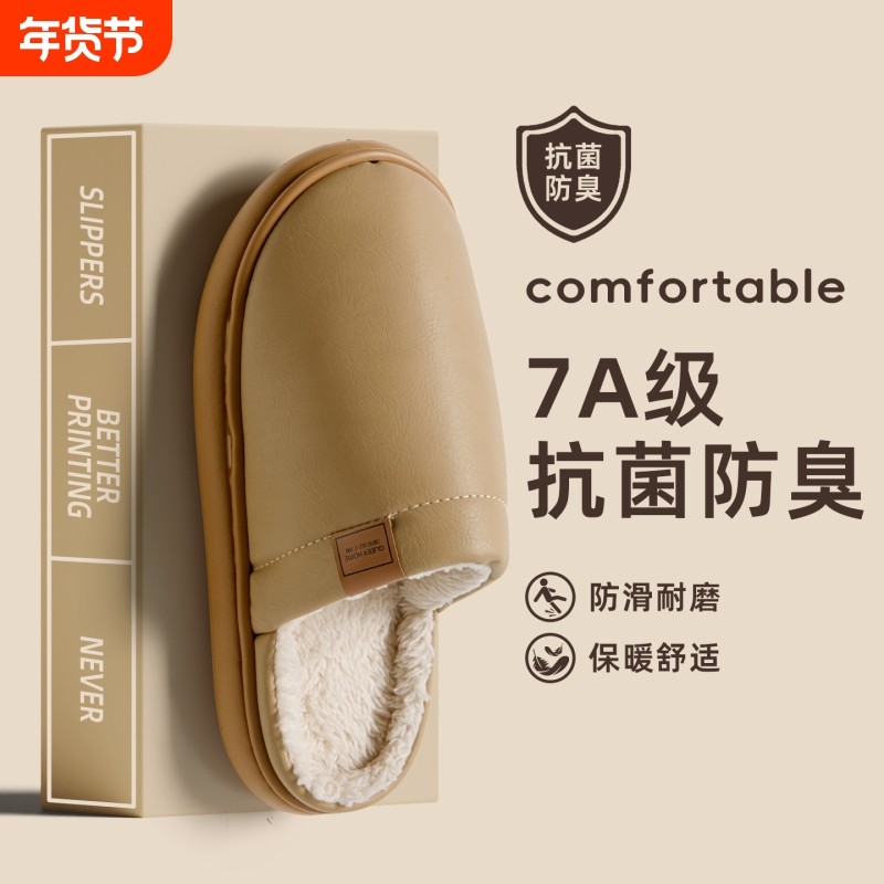 防水棉拖鞋男女冬季室内加绒保暖家居家防滑防臭抑菌PU皮拖秋冬天
