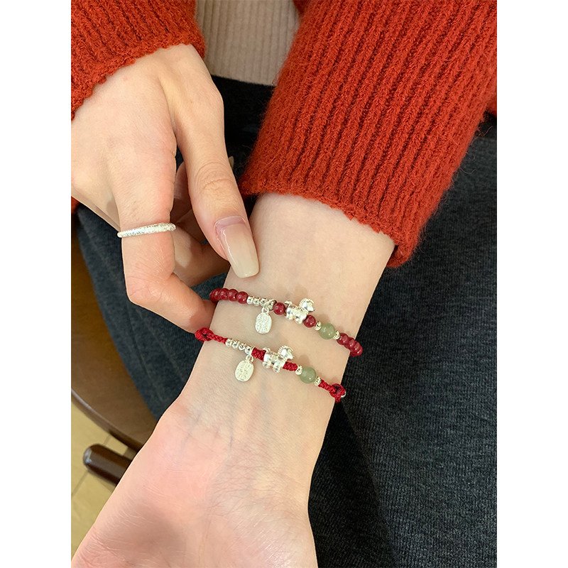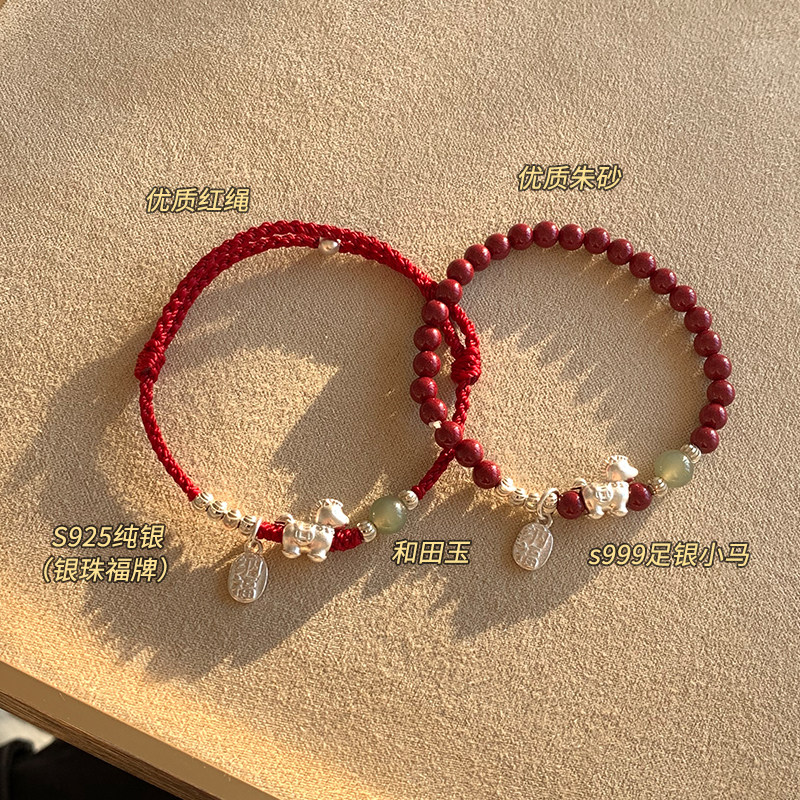 s999纯银和田玉小马朱砂红绳马年本命年手链女款礼物手串叠戴足银