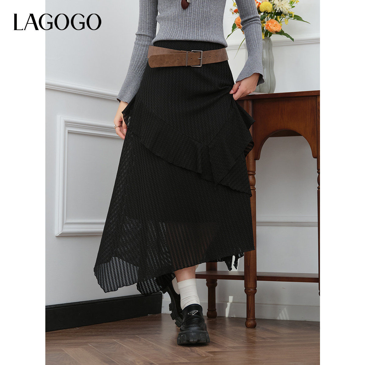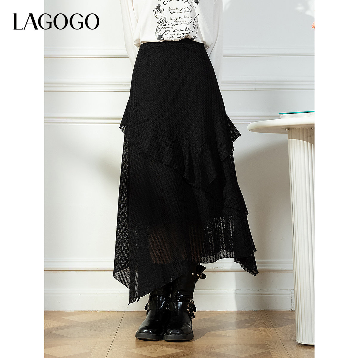 LAGOGO优雅不规则半身裙女拉谷谷2026春新款蕾丝米白色裙子