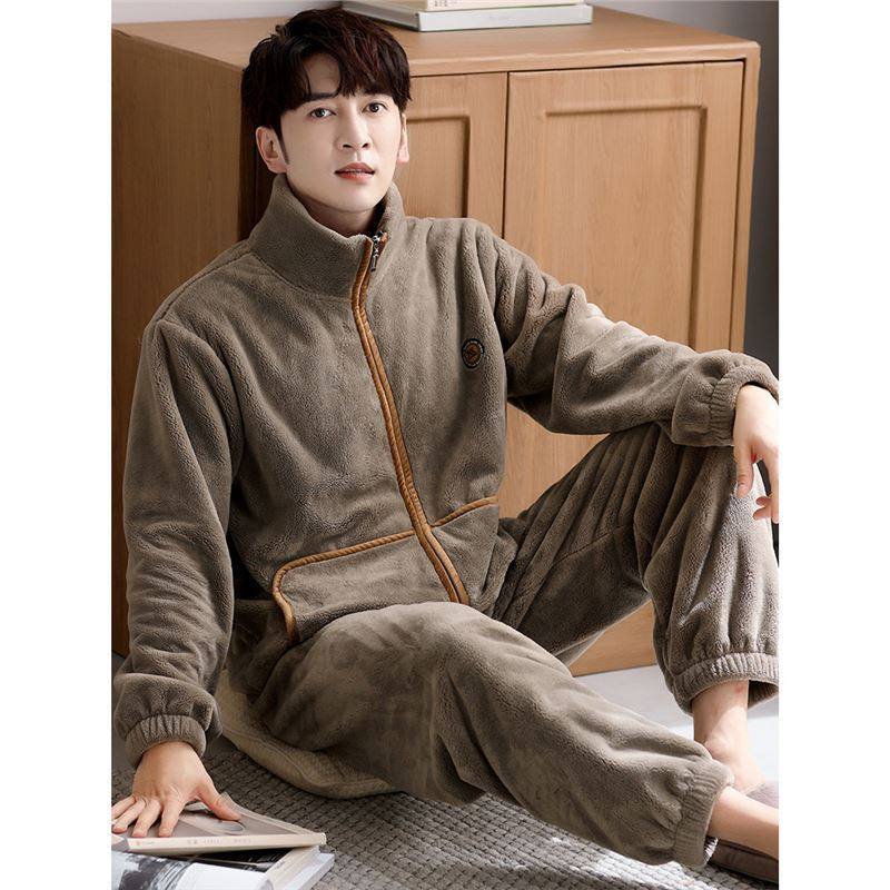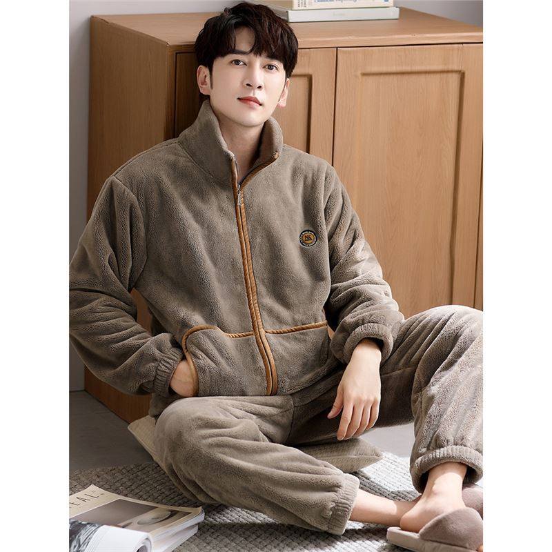 冬季珊瑚绒男士睡衣三层夹棉加厚加绒法兰绒秋冬款家居服保暖套装
