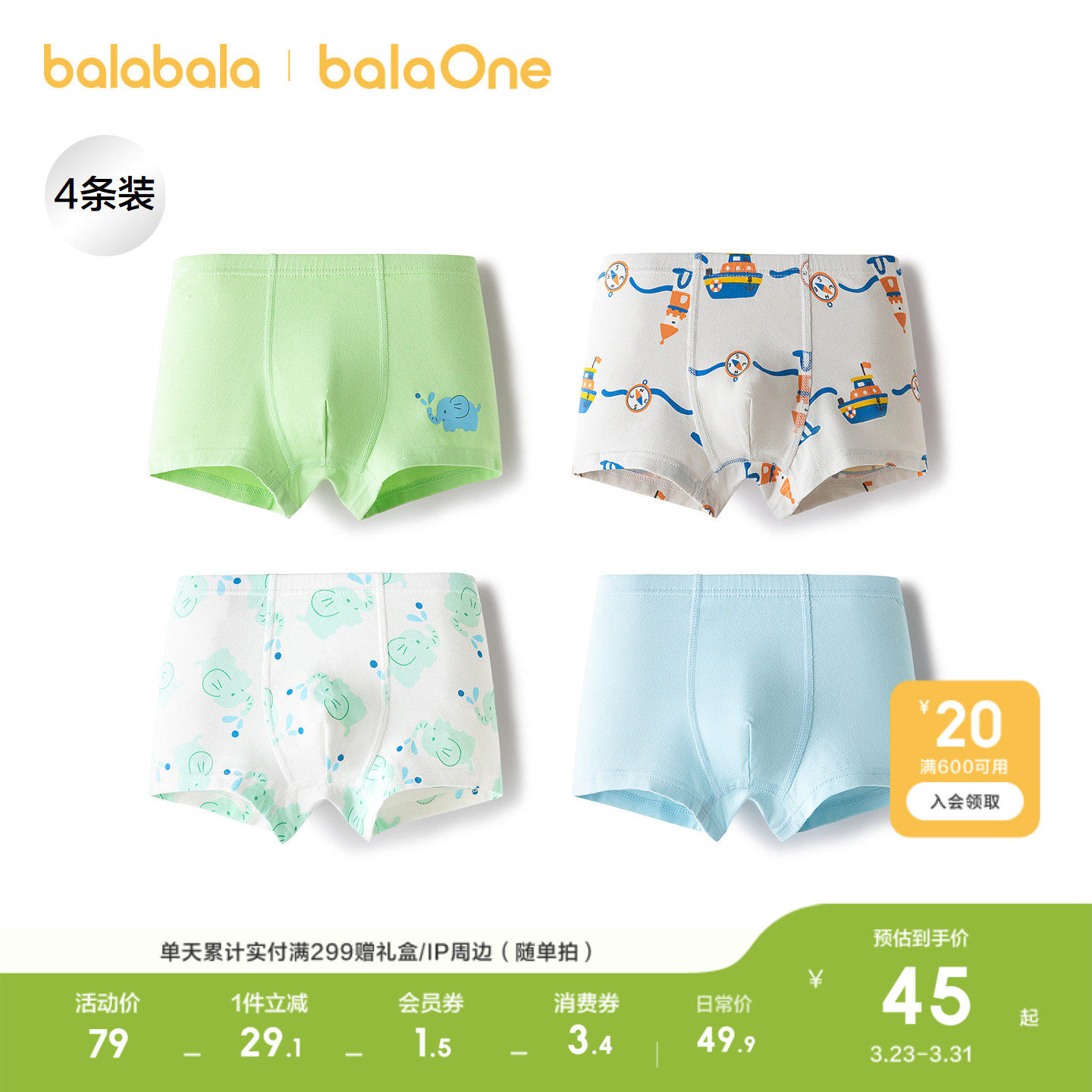 巴拉巴拉男童内裤棉平角儿童四角短裤小童宝宝不夹PP抗菌潮四条装