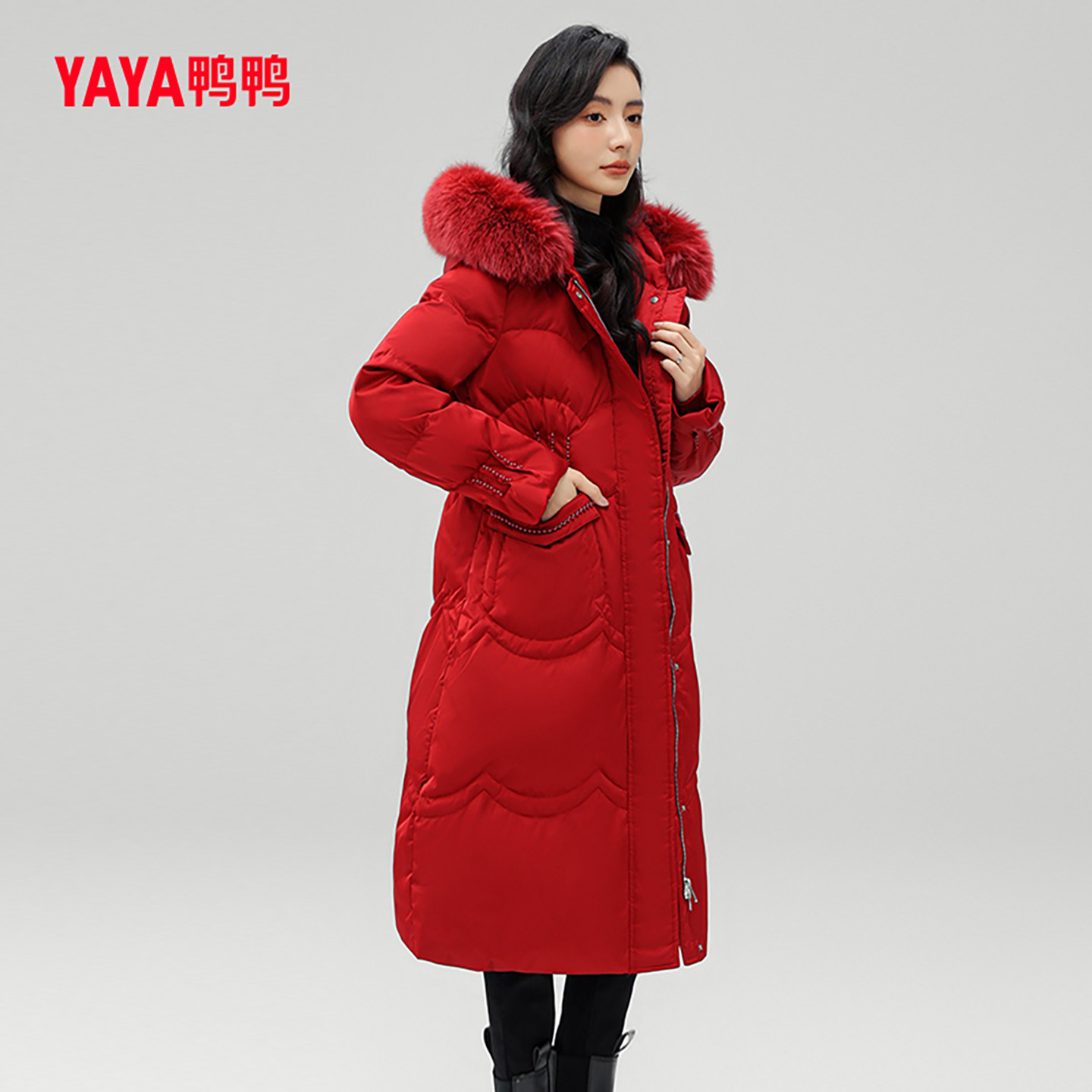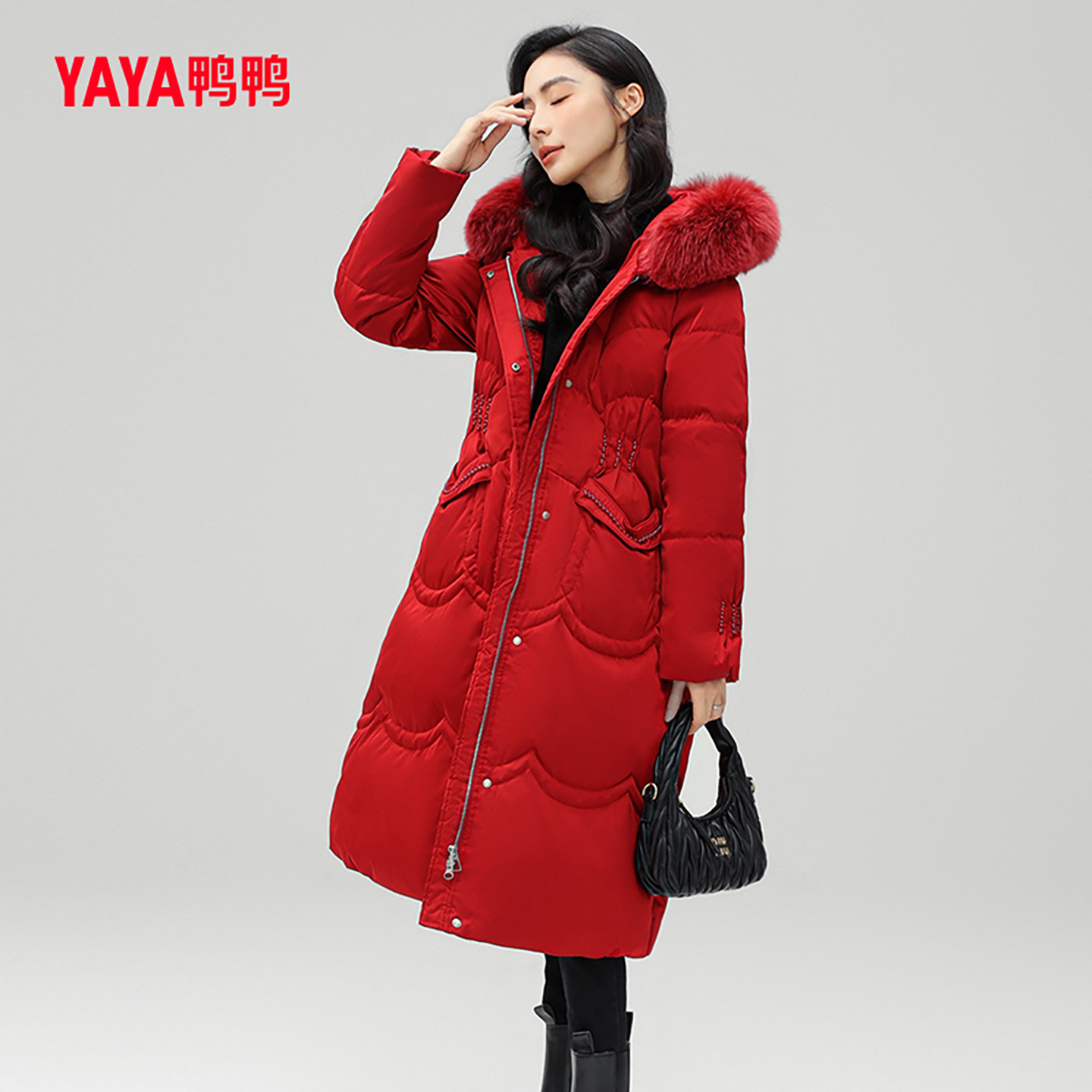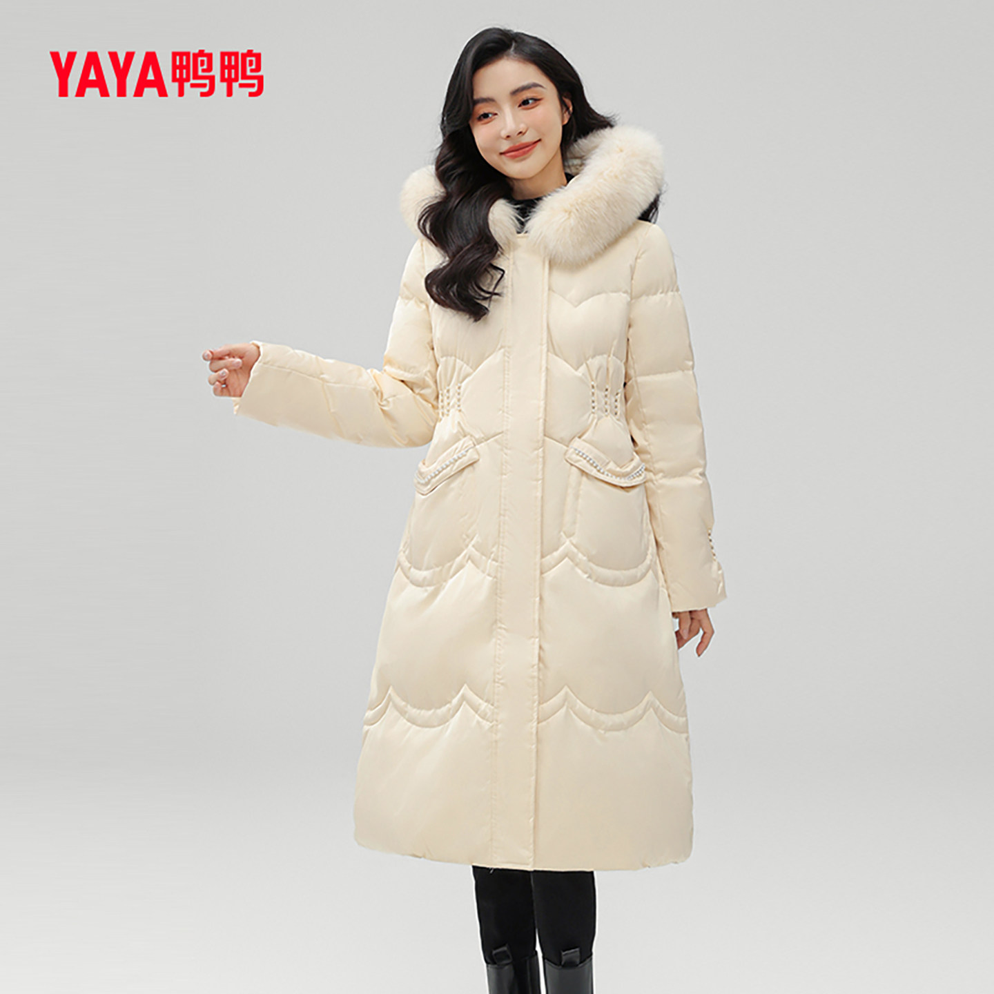 鸭鸭羽绒服女2023年冬季防寒中长款狐狸毛领气质时尚宽松外套W