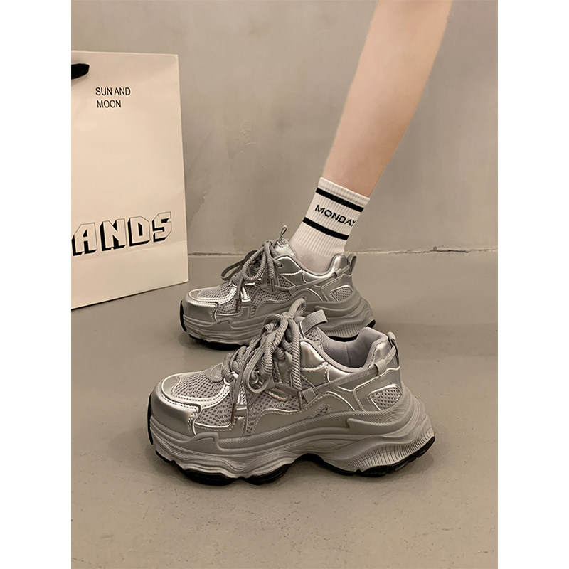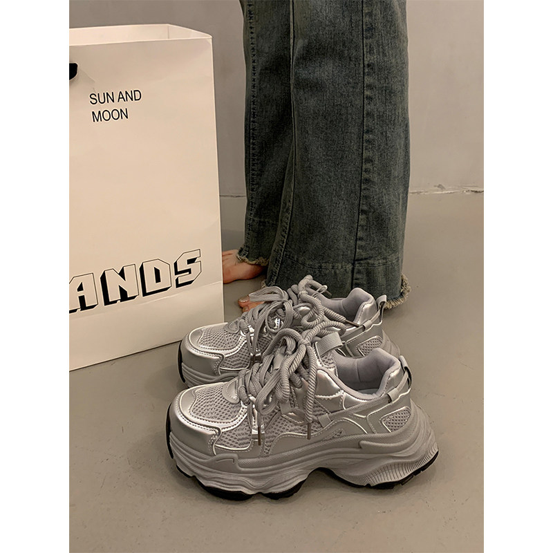 爆款松糕厚底老爹鞋女秋季小个子增高2025新款银色百搭休闲运动鞋