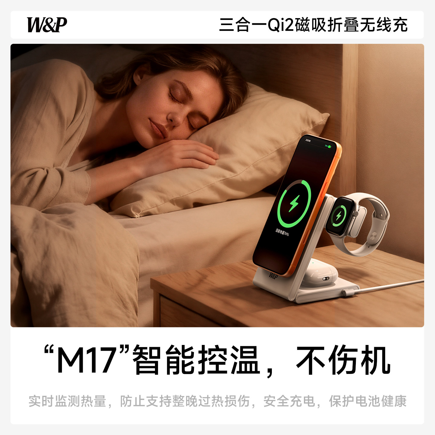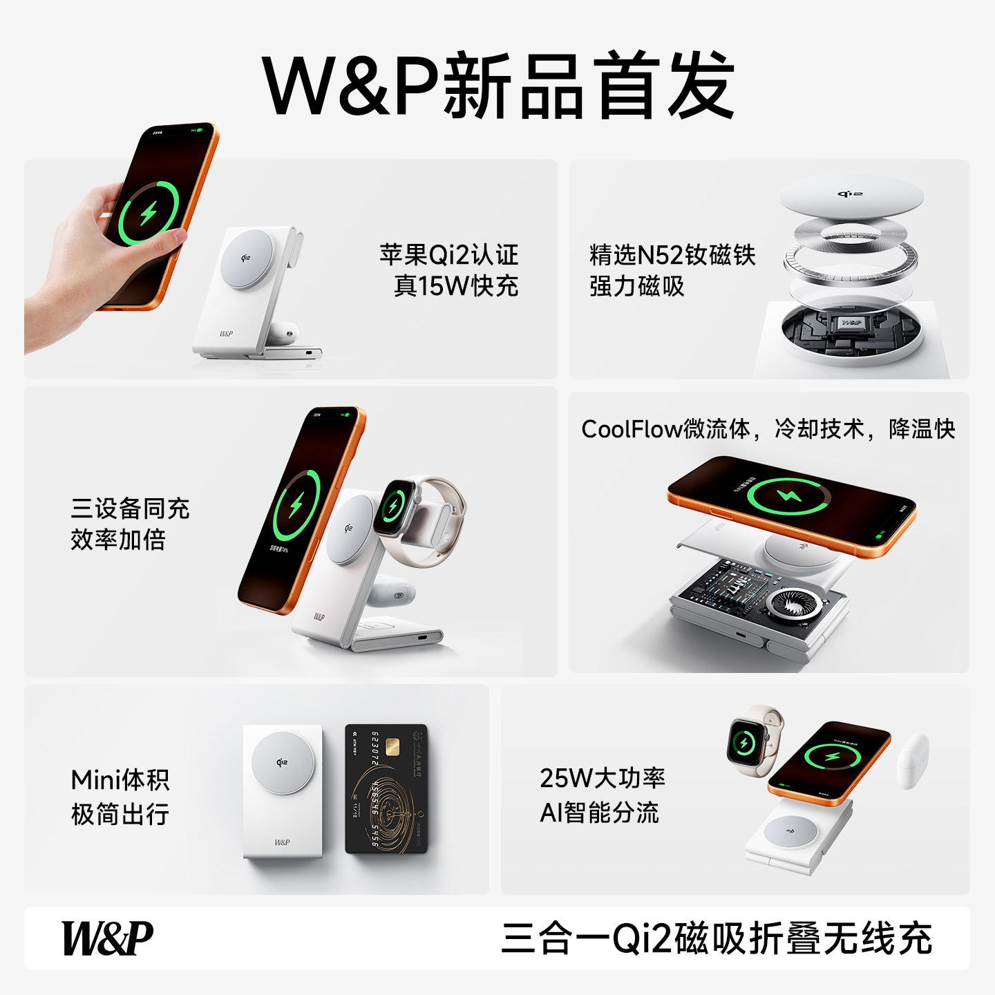 【W&P】Qi2三合一无线充电器15w快充Magsafe磁吸适用iPhone17Pro手表applewatchS11耳机折叠立式桌面支架便携