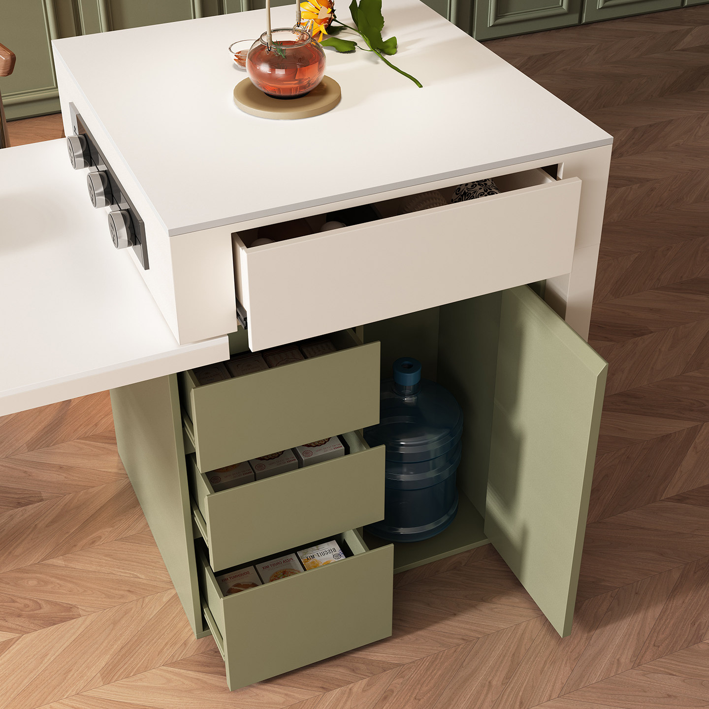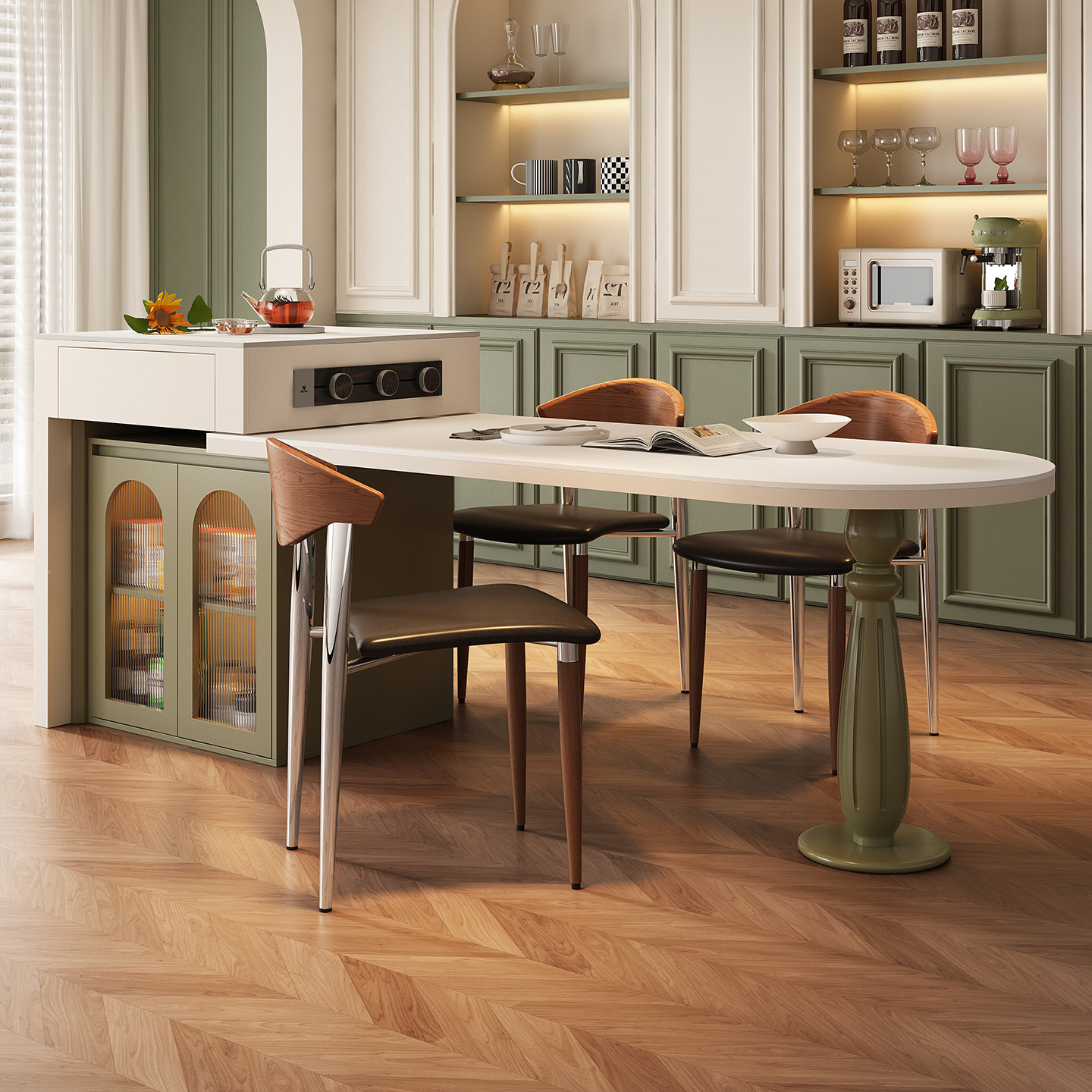 中古法式风岩板岛台多功能餐桌可伸缩一体家用大小户型餐厅带储物