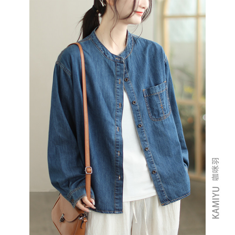 咖咪羽简约大方亲肤织棉水洗牛仔圆领长袖通勤薄外套衬衫宽松女