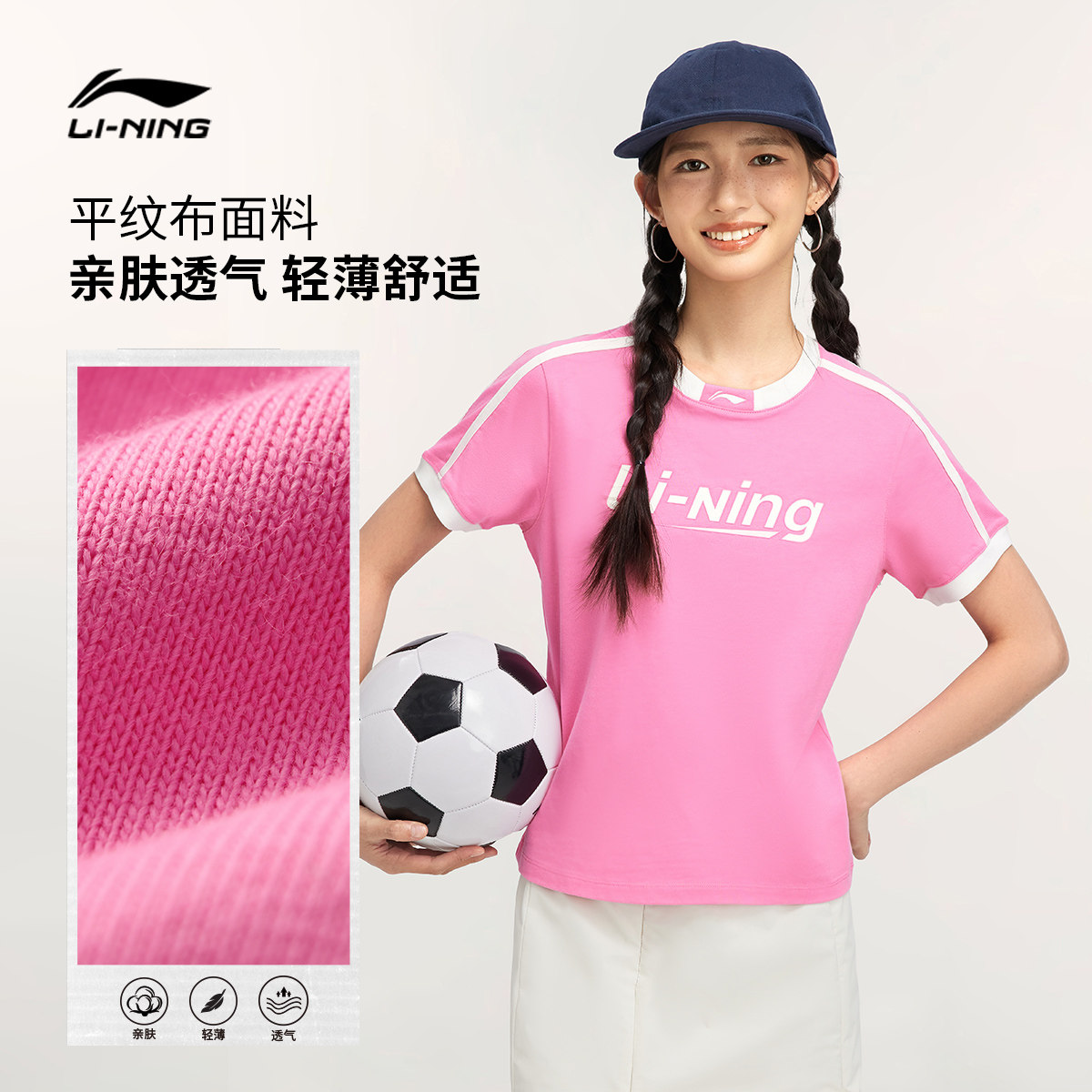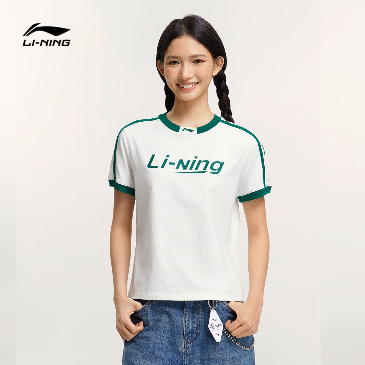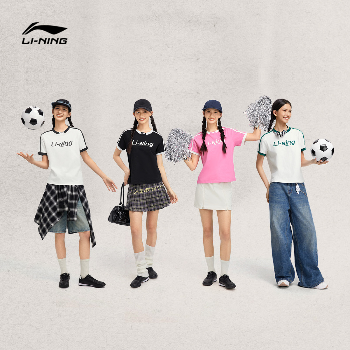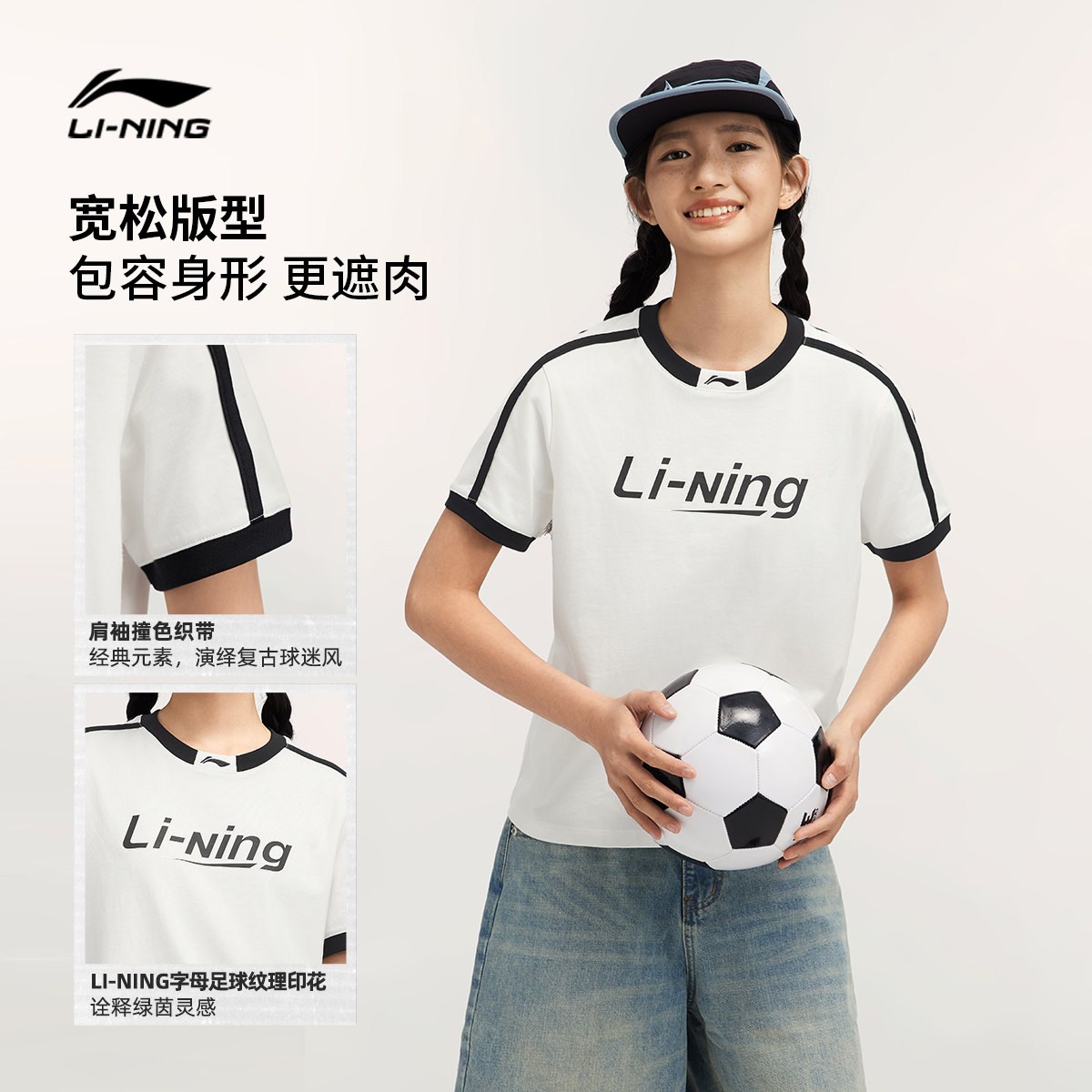 李宁短袖女士春夏黑色上衣圆领女装透气休闲复古半袖运动正肩T恤