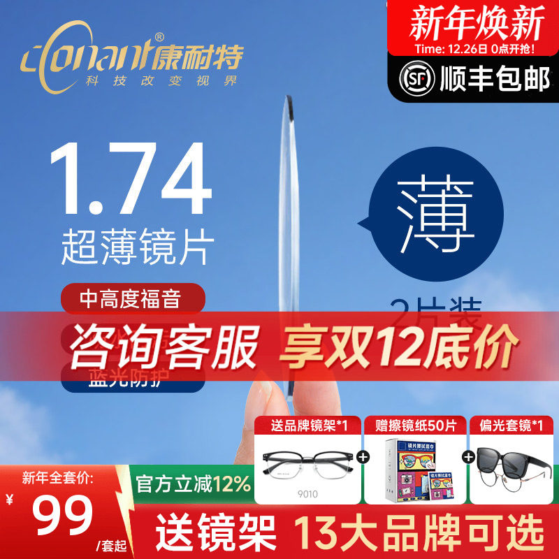 康耐特镜片超薄1.74非球面高度近视防蓝光fix双非双曲面配眼镜片