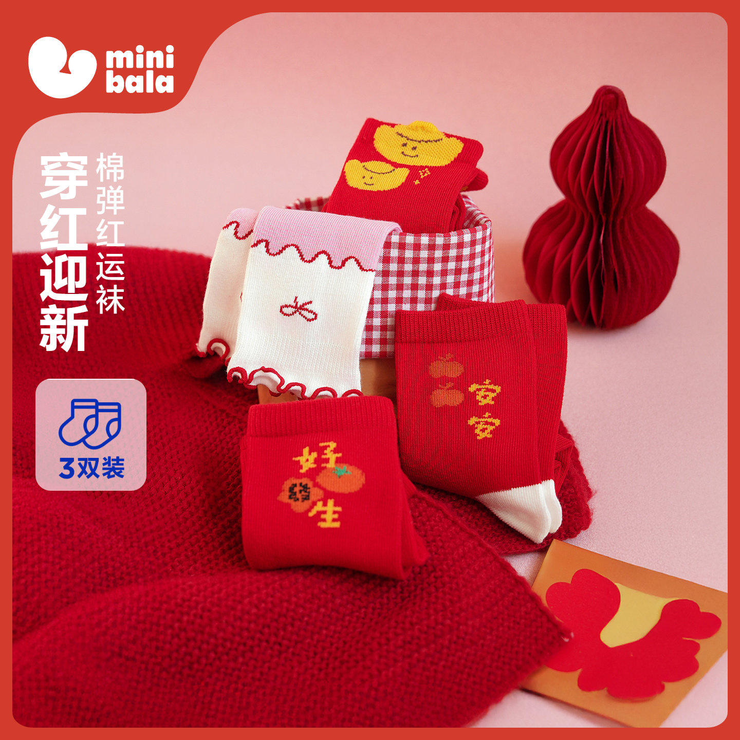 【3双装】迷你巴拉巴拉儿童袜子男女宝宝中筒袜新年红色本命年冬