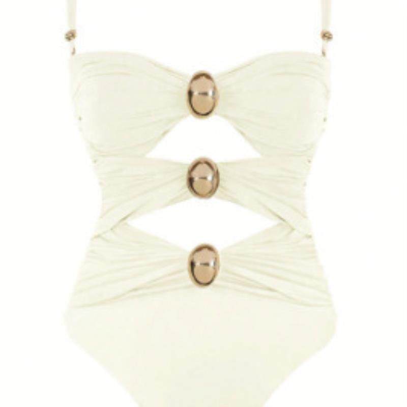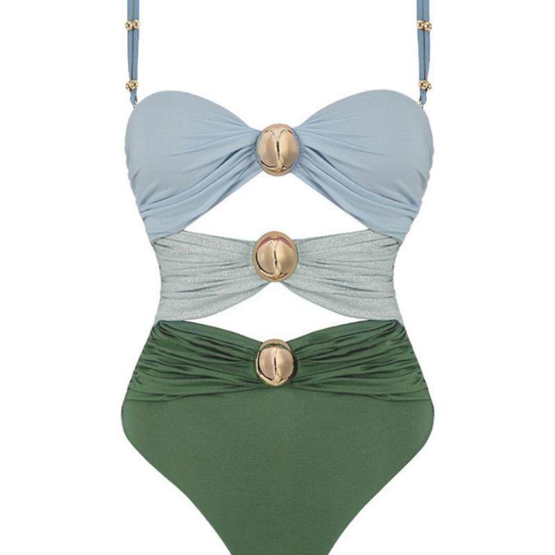 2025欧美外贸新款拼接金属扣镂空连体泳衣女高腰显瘦高级感比基尼