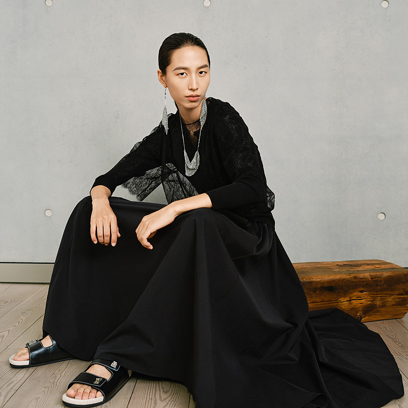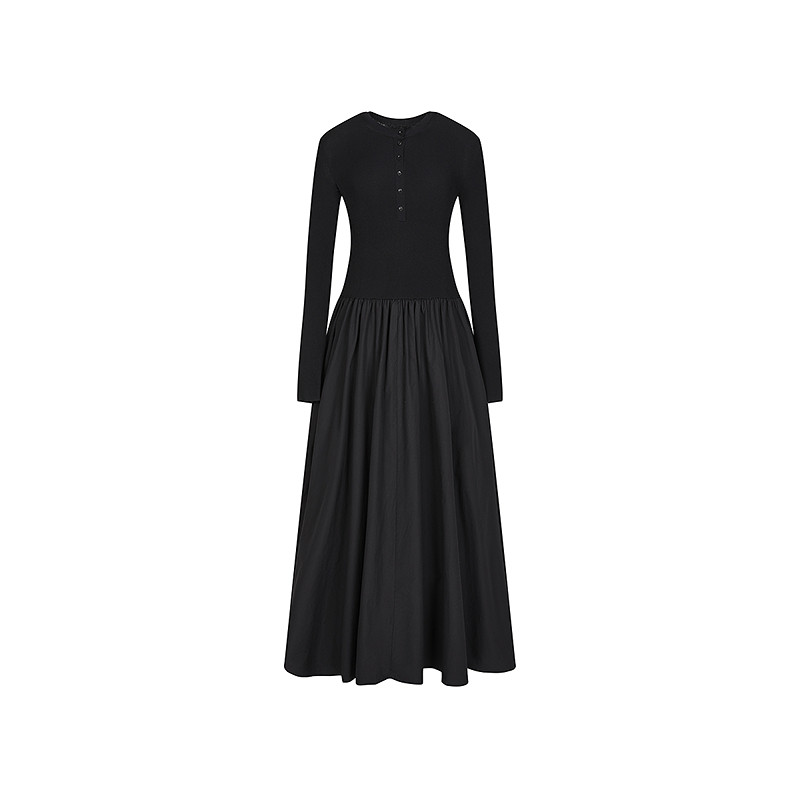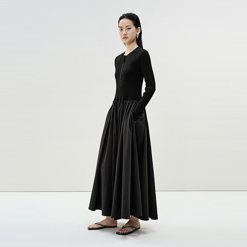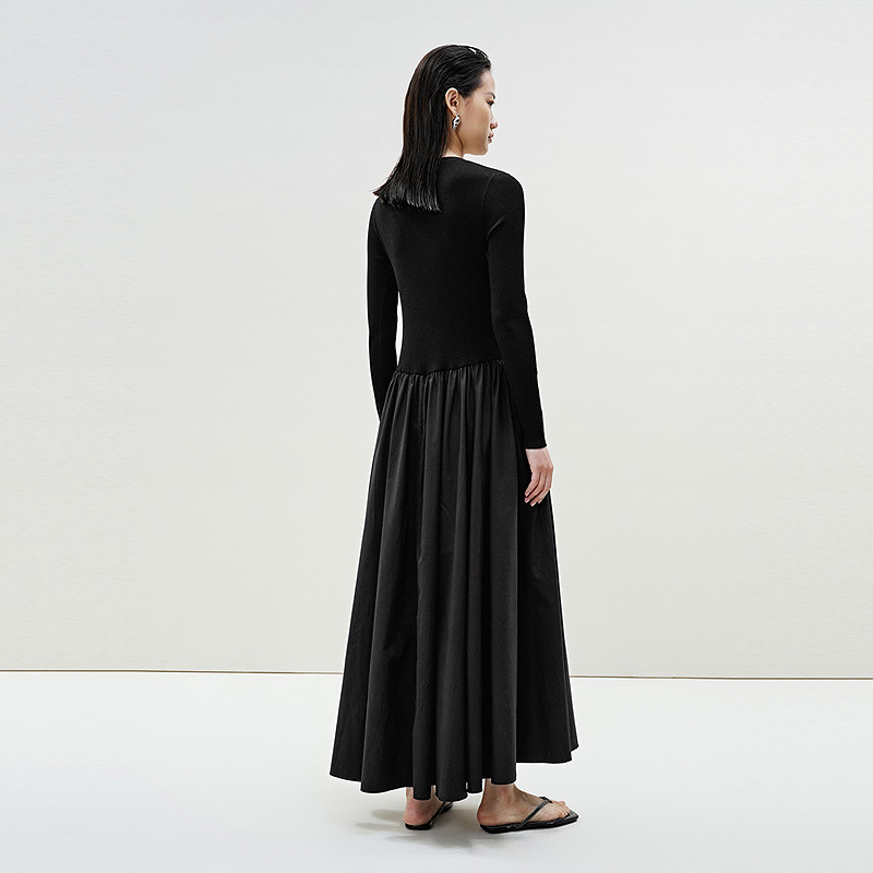 LESS春季针织拼接连衣裙女赫本风黑色圆领长款显瘦裙子2P3G12850