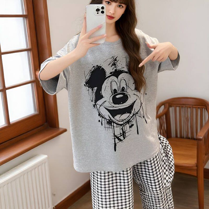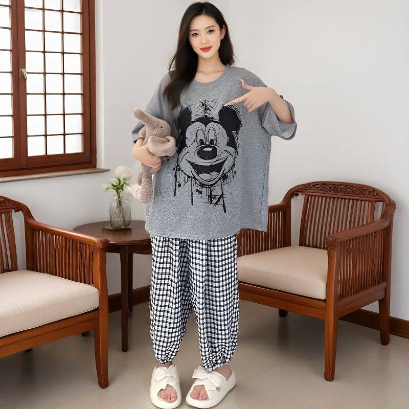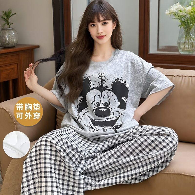 带胸垫短袖睡衣女卡通圆领夏季短袖长裤休闲宽松家居服可外穿