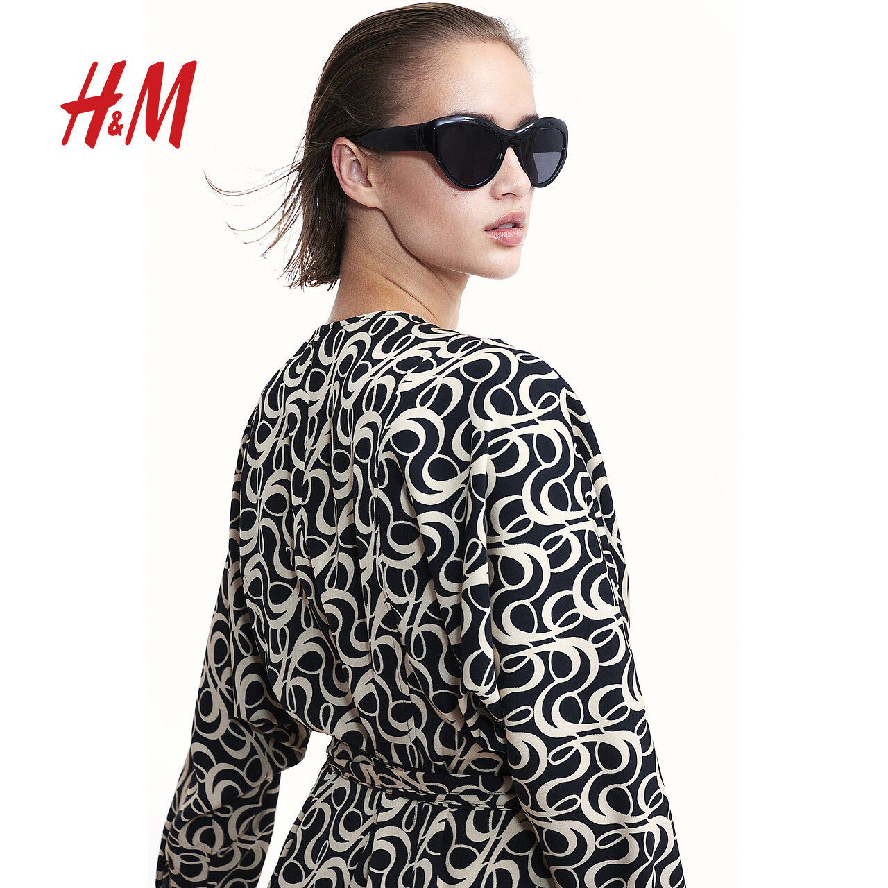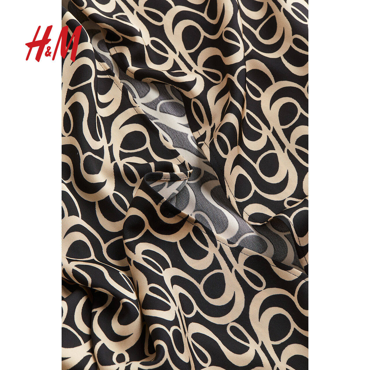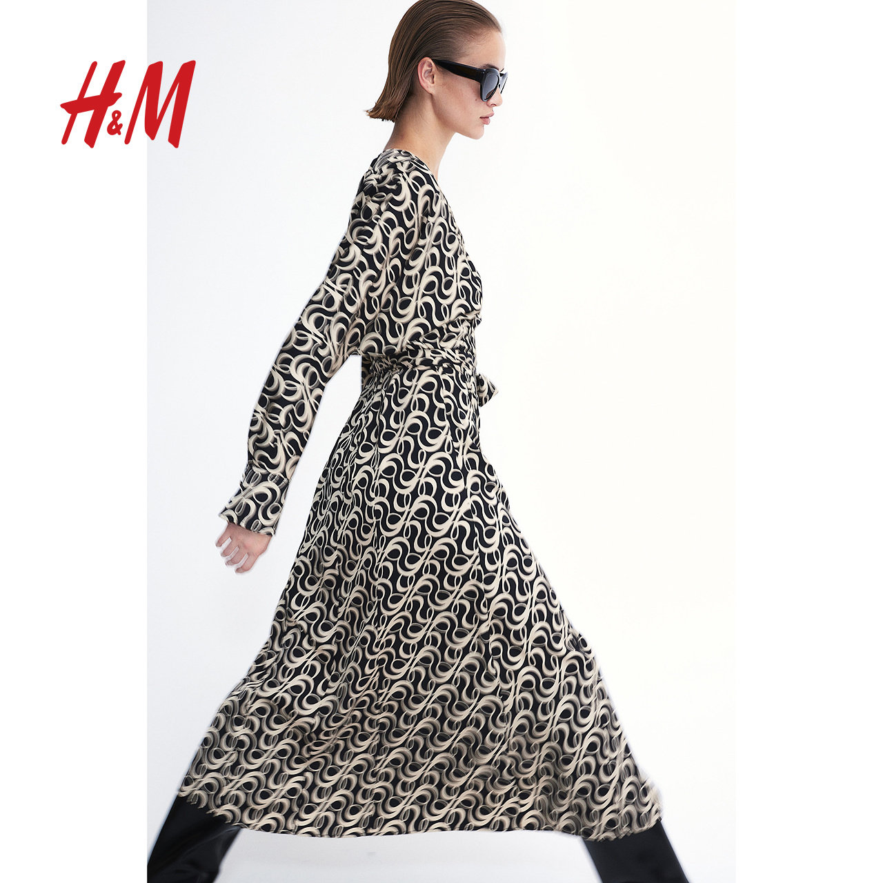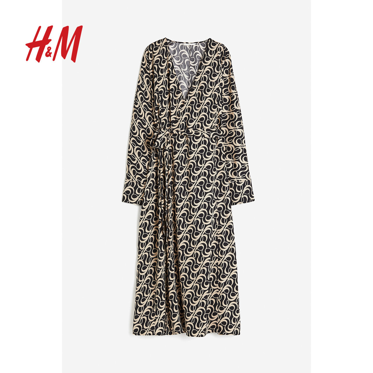 HM女装连衣裙冬季时尚休闲深V领长袖围裹式中长裙1209966