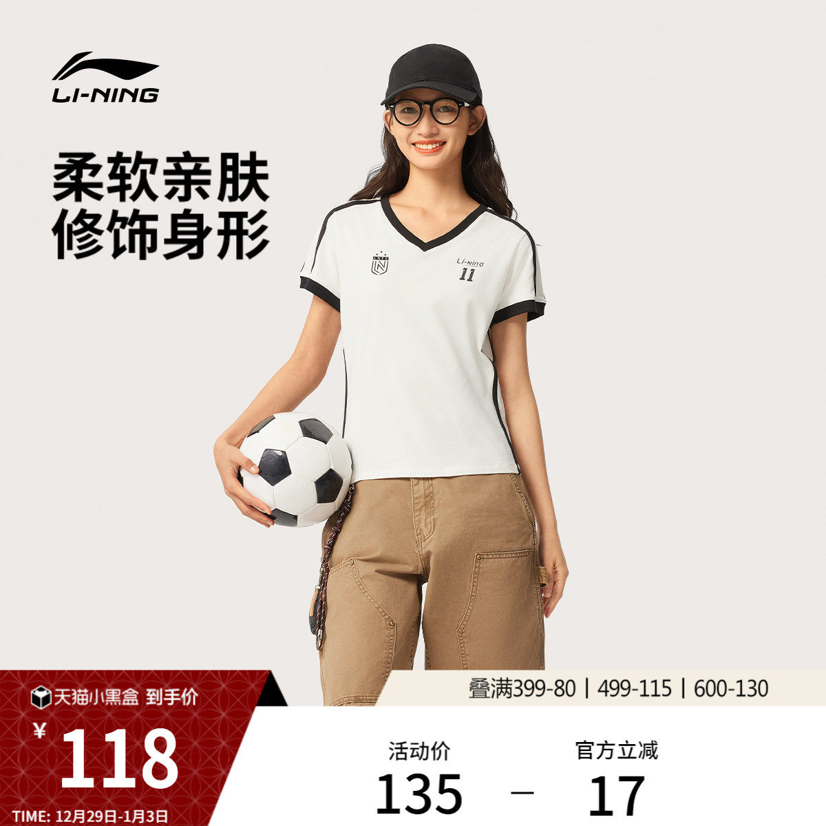 李宁短袖女士夏季新款女装网球风V领上衣白色半袖印花正肩运动T恤