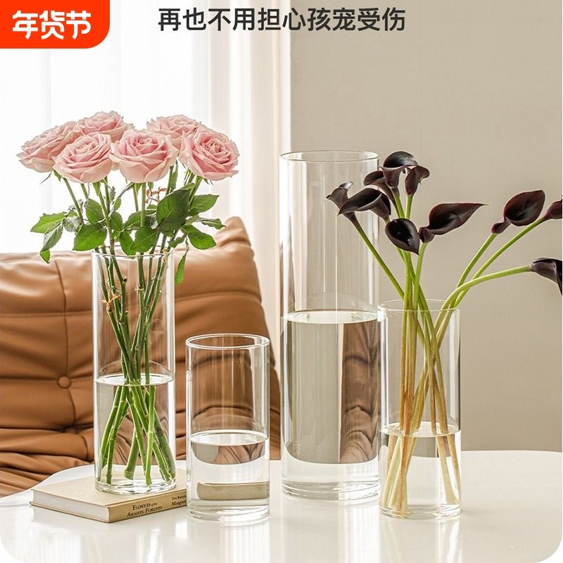 轻奢玻璃花瓶直筒透明水养鲜花百合富贵竹ins高颜值客厅装饰摆件